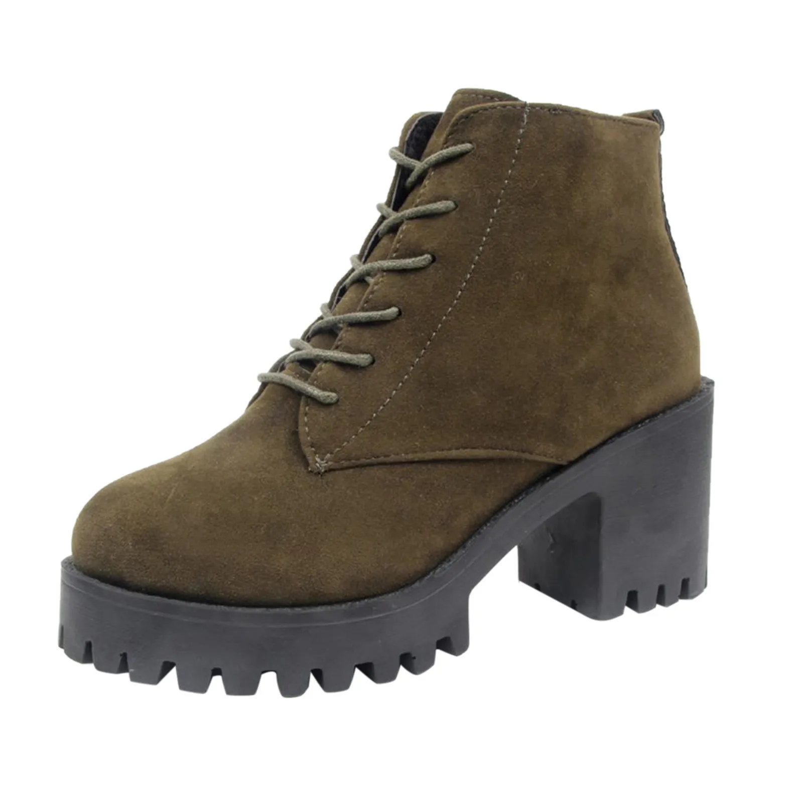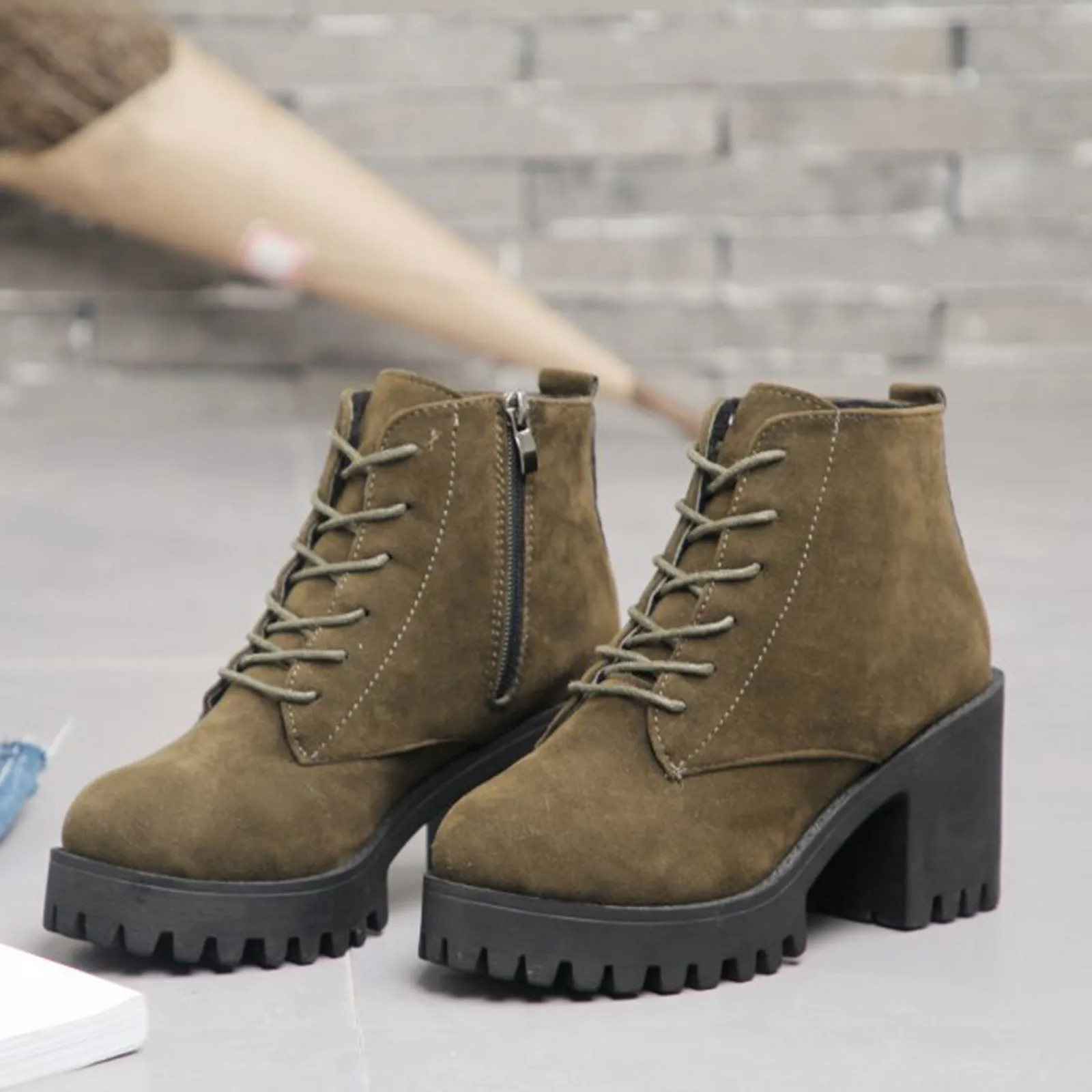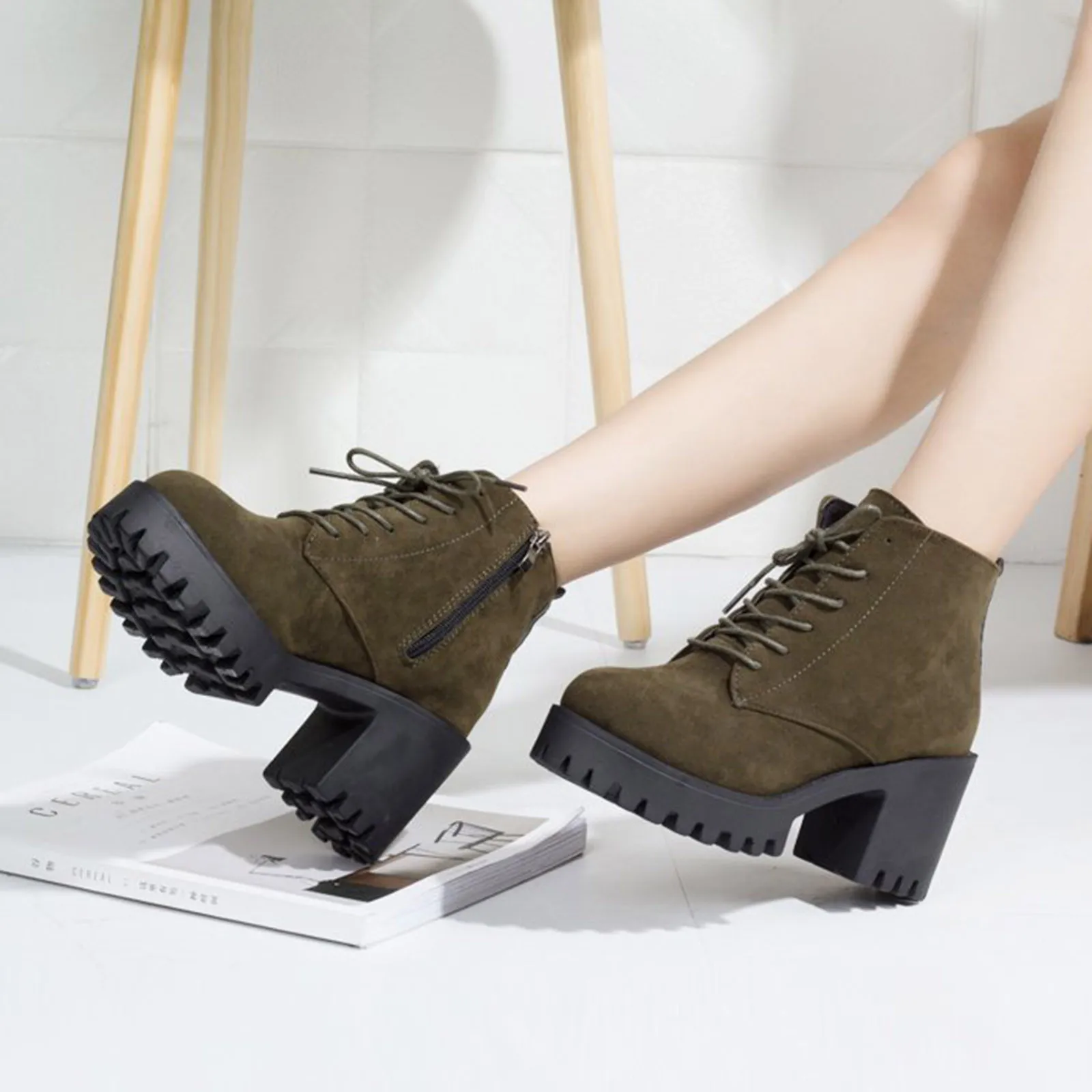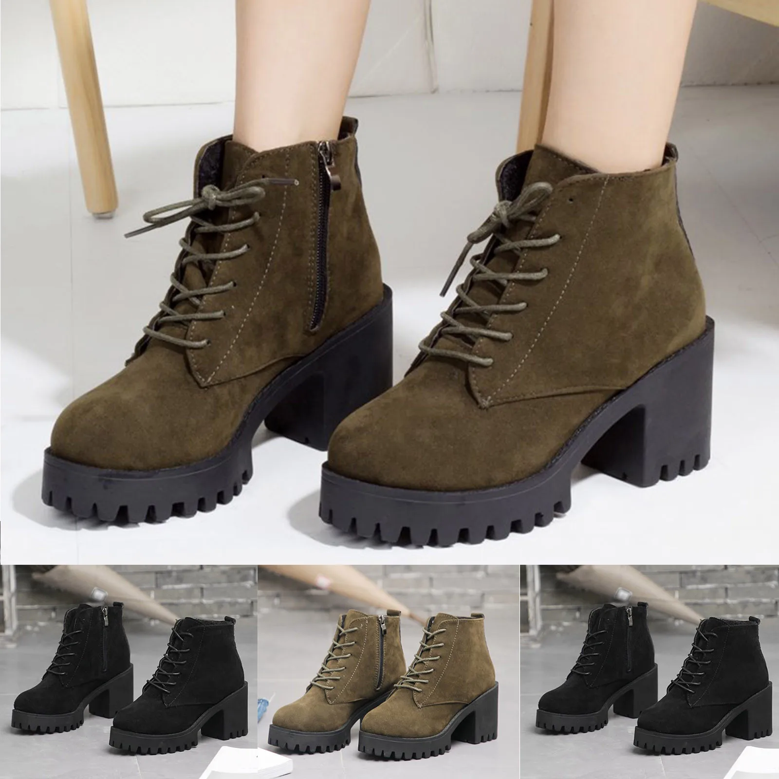 Женские ботинки; Коллекция 2021 года; Зимние ботинки для женщин; Модная обувь на квадратном каблуке; Рабочие ботинки из флока на шнуровке; Цвет армейский зеленый; Распродажа