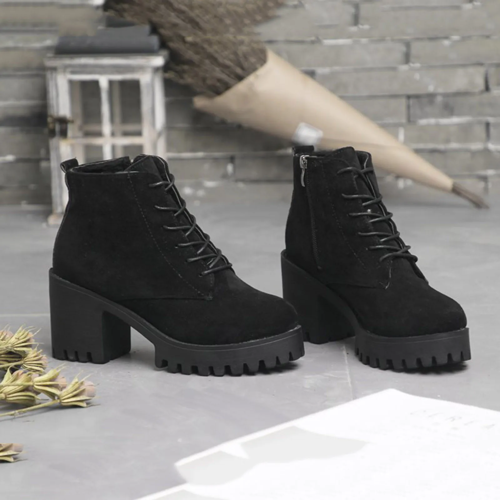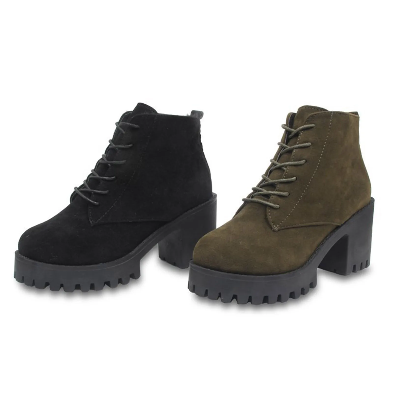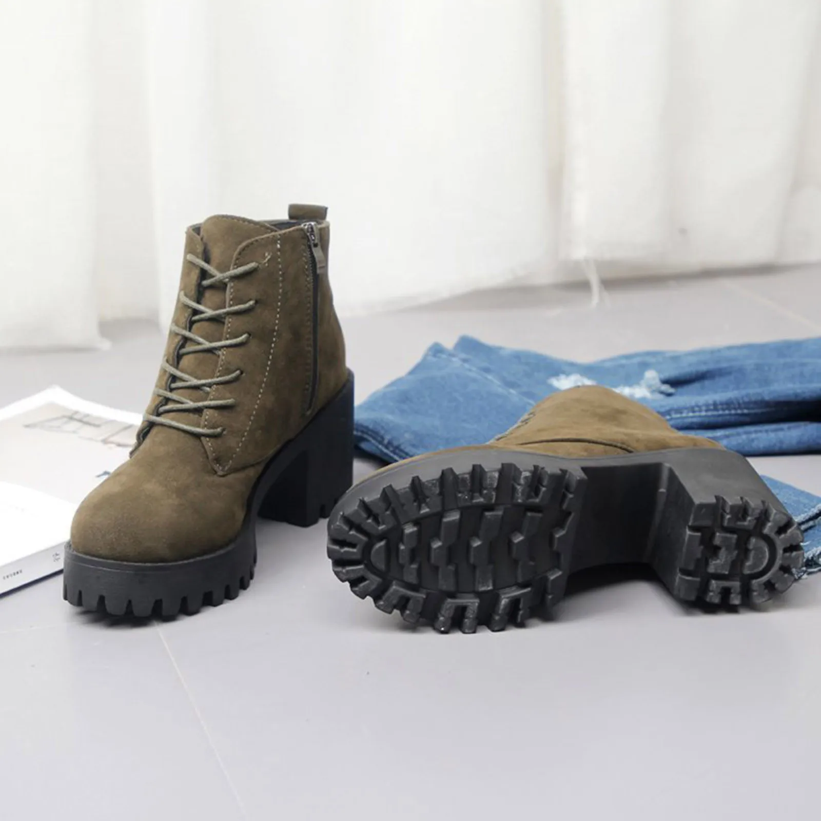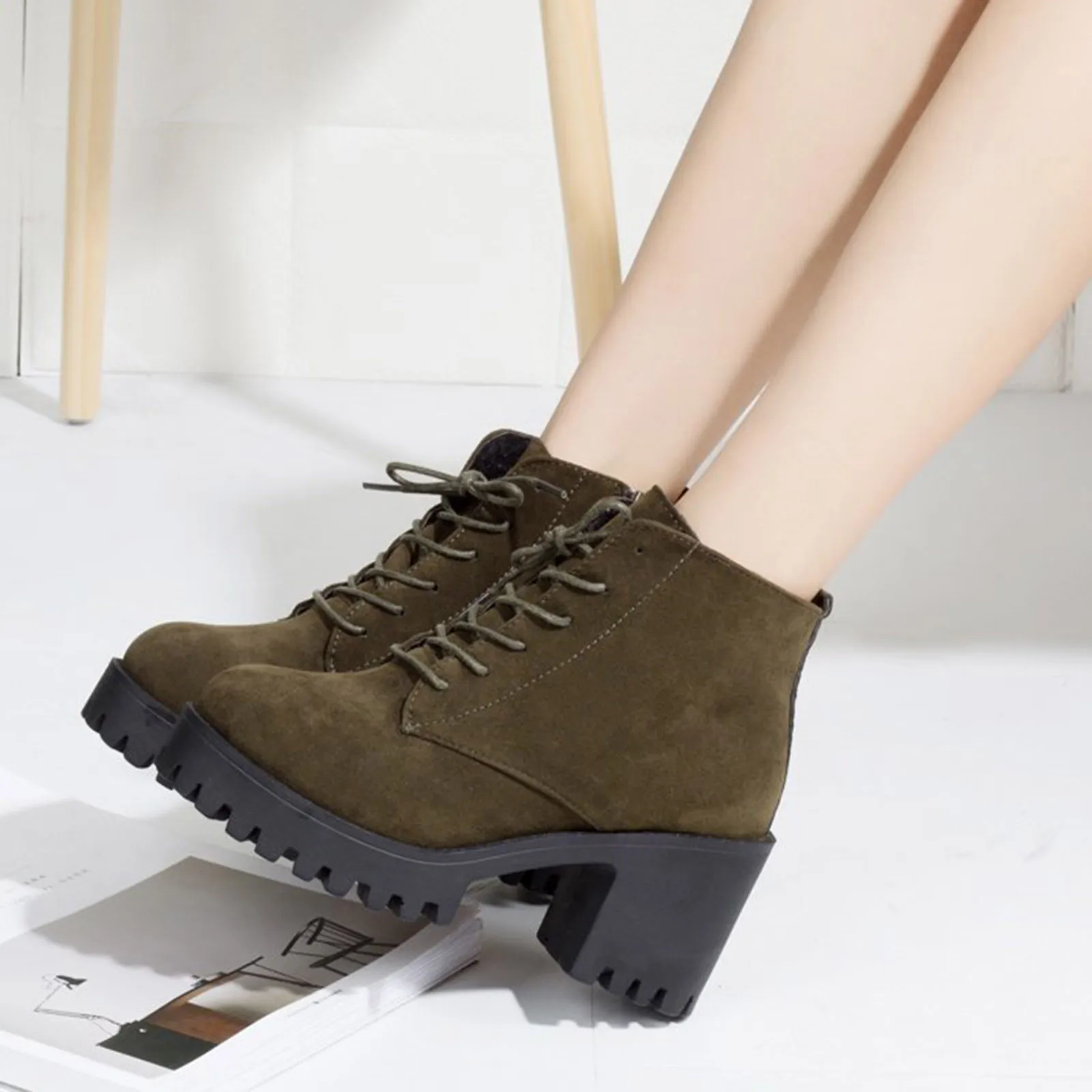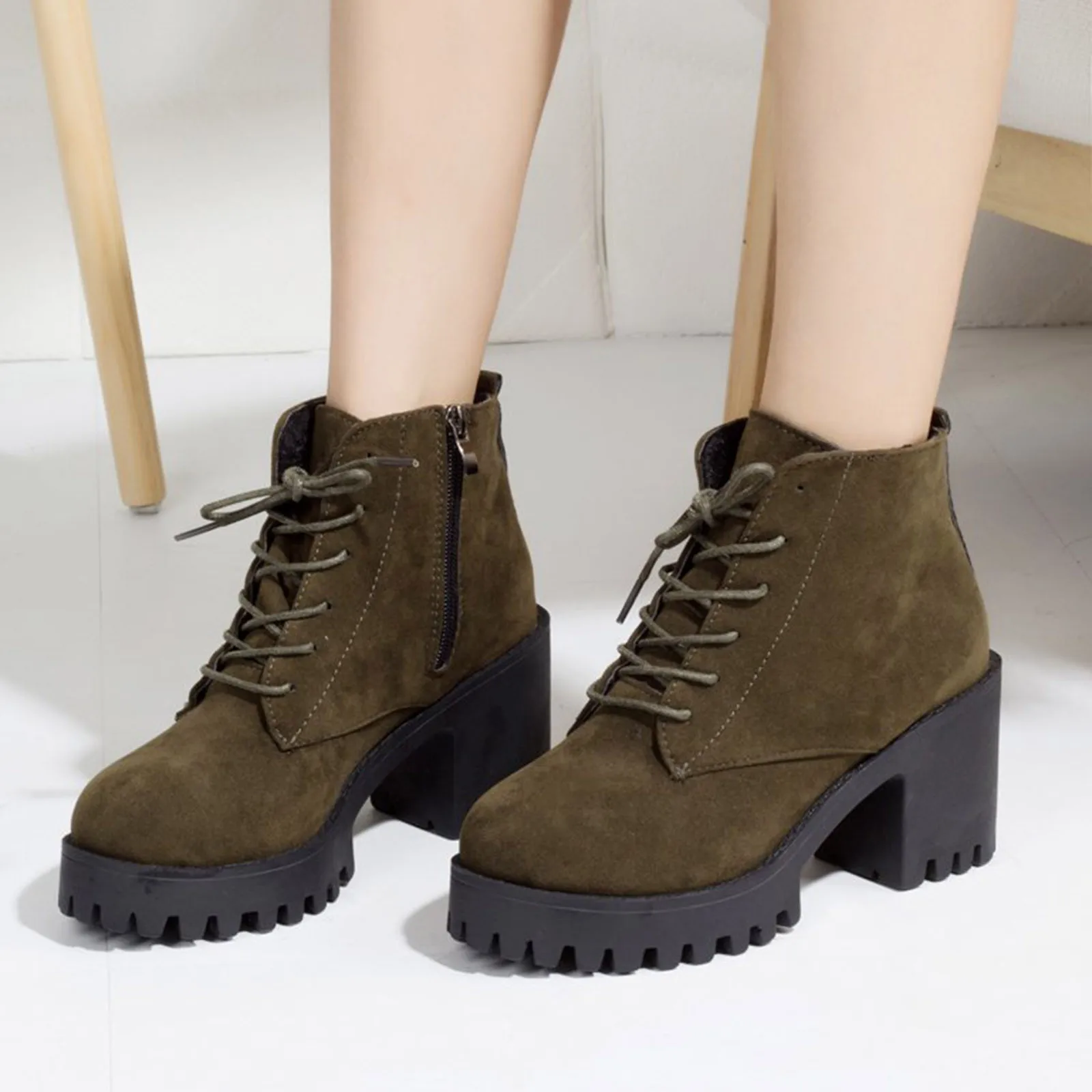 Женские ботинки; Коллекция 2021 года; Зимние ботинки для женщин; Модная обувь на квадратном каблуке; Рабочие ботинки из флока на шнуровке; Цвет армейский зеленый; Распродажа