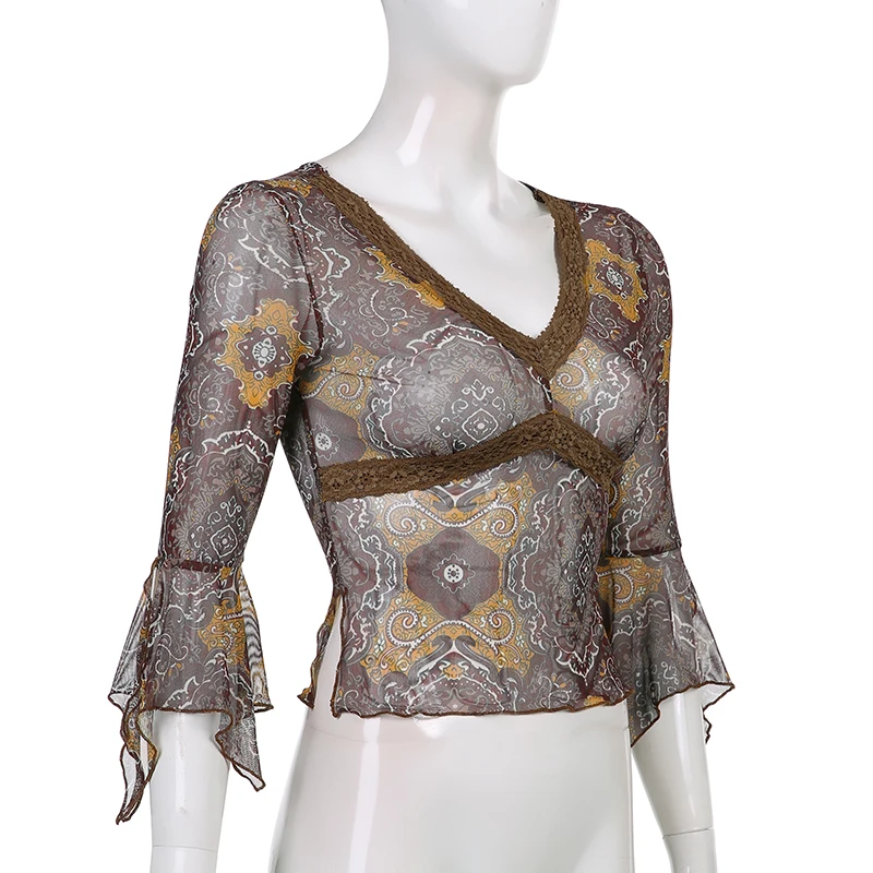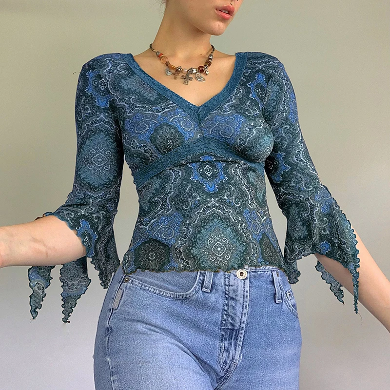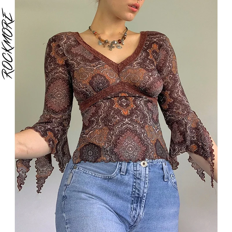 Женская укороченная футболка Rockmore, осенняя, сетчатая, с V-образным вырезом и винтажным принтом, в стиле Харадзюку