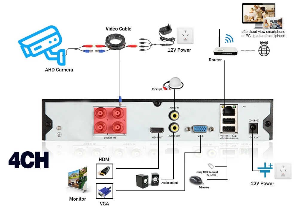 Простая настройка, всего 4 шага для просмотра мобильный телефон, просмотра видео в режиме реального времени из любого места и в любое время с помощью смартфона, стола или ПК с передовой технологией P2P, вы можете получить удаленный доступ к вашей системе за считанные минуты или меньше, нет необходимости в переадресации, удаленный доступ никогда не был таким простым!