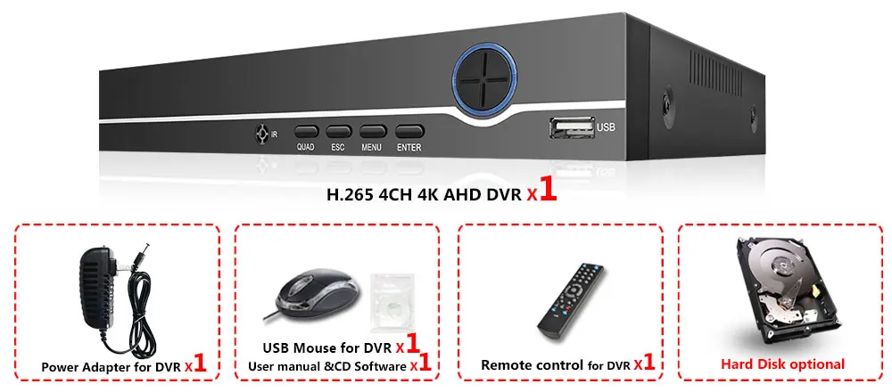 1 х H.265 4CH 4K 6 в 1 AHD DVR гибридный цифровой видеорегистратор;1 x Блок питания для DVR;1 X USB мышь для DVR;1 компакт-диск программного обеспечения для DVR;1 пульт дистанционного управления для DVR;Жесткий диск опционально!