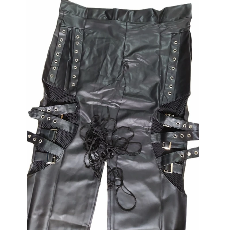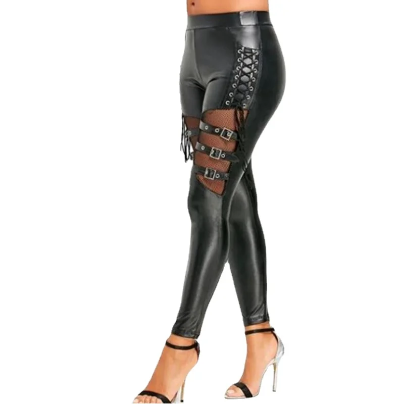 Женские обтягивающие эластичные леггинсы из ПУ кожи с металлической пряжкой