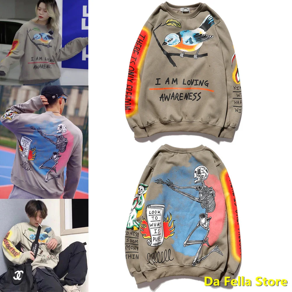 Худи KANYE с принтом в виде граффити, черепа, птицы, флисовый свитш...