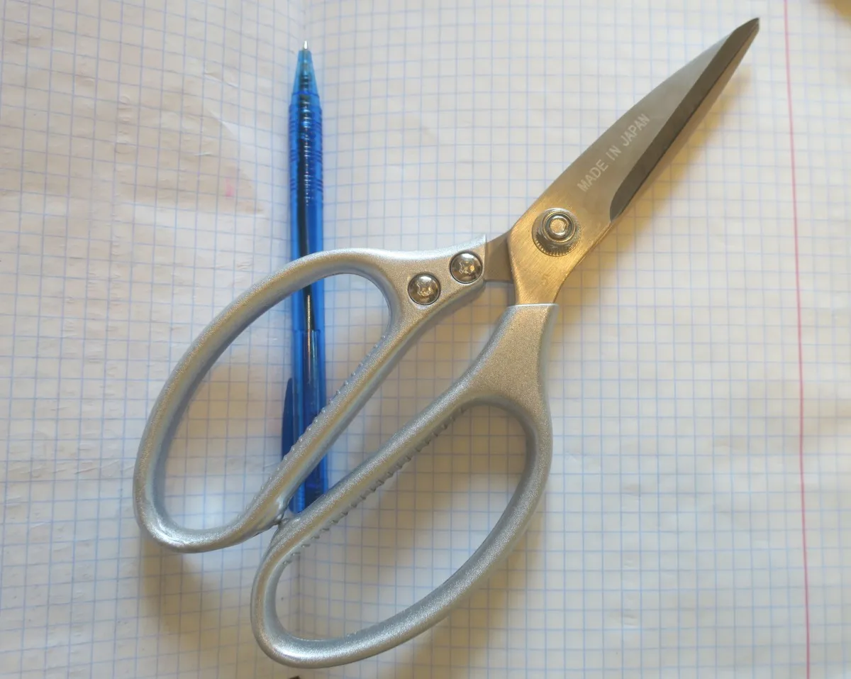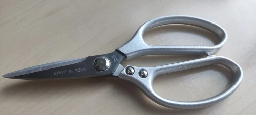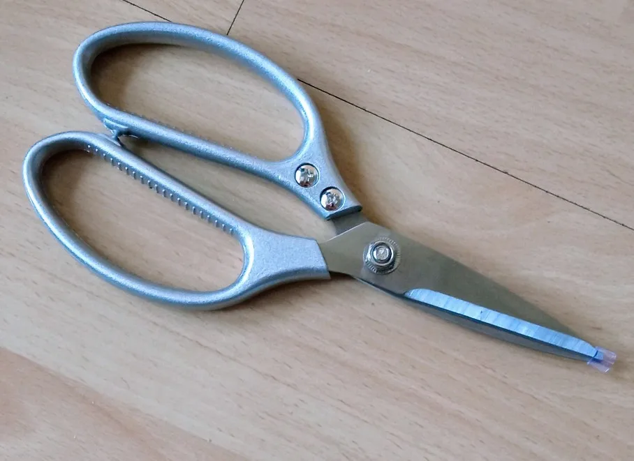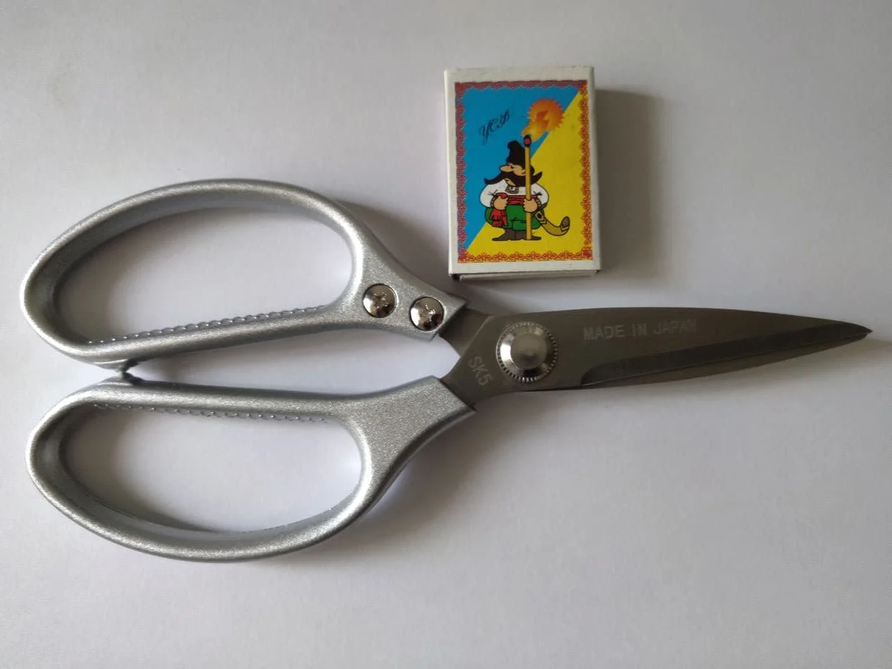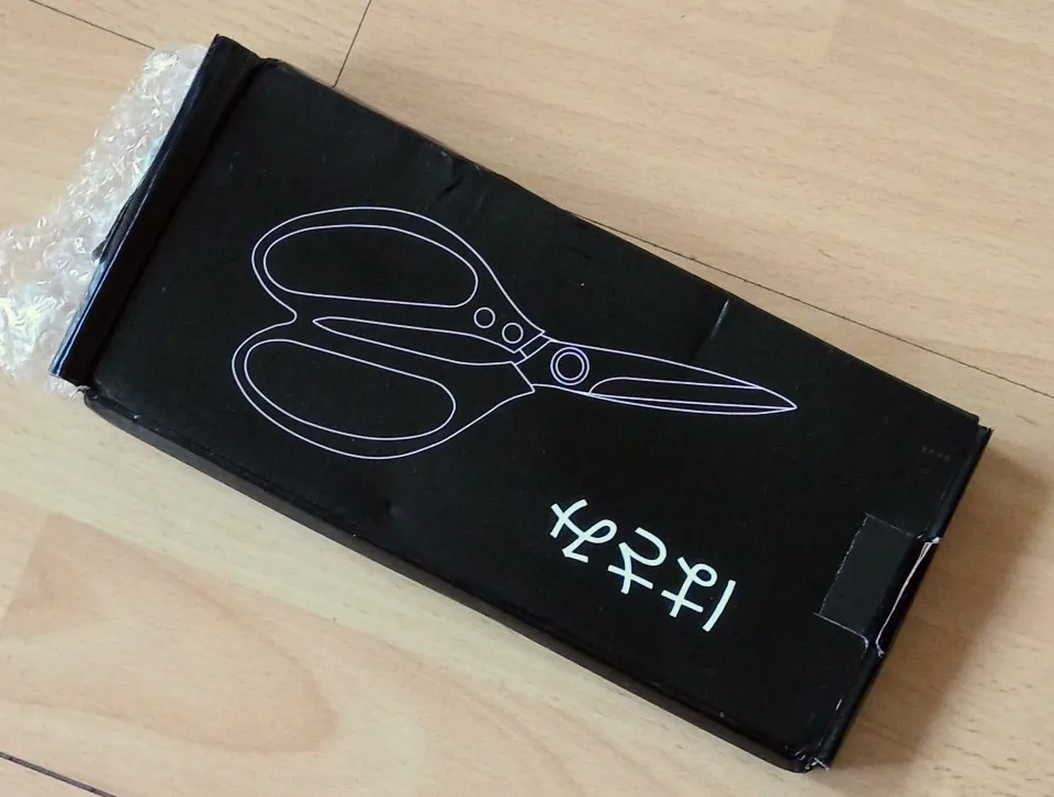 Доехало до Вильнюса очень быстро, две недели буквально. Черная коробка с надписью "Ножницы" на японском. Никаких других надписей или штрих кодов нет. Марку стали остаётся принять на веру, есть аналогичные модели с надписью "нержавеющая сталь". Это обычная лазерная гравировка - можно что угодно написать - любую страну производителя, любую сталь. Скорее всего, это какая-то реплика на японскую модель. Ножницы режут, конечно, но качество исполнения среднее. Мелкие огрехи слесарки, концы не сходятся. Есть регулировка, ручки из покрашенного алюминия. В принципе, за такую цену покупка, я считаю, нормальная.