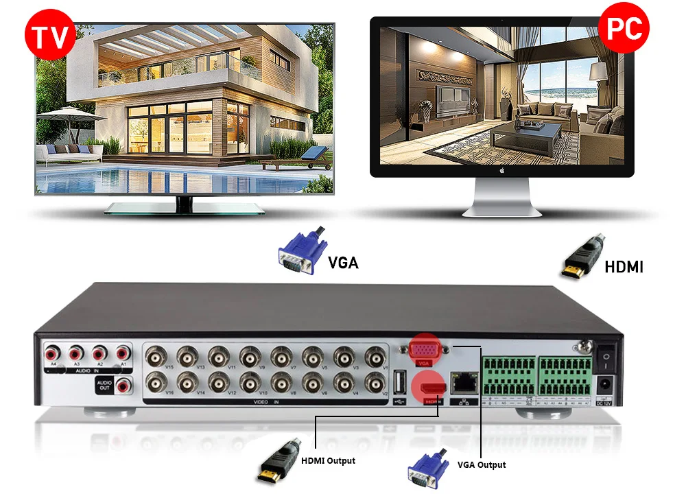 Просмотр на мониторе HDMIЛегко отображать видео через порт HDMI вашего монитора компьютера, чтобы в полной мере воспользоваться ясностью системы безопасности. (Кабель HD не входит в комплект)Просмотр по телевизору или монитору ПКДля дополнительного удобства видеорегистратор также поставляется с разъемами VGA и BNC для стандартных вариантов просмотра разрешения. (кабель VGA или BNC к RCA не входит в комплект.)