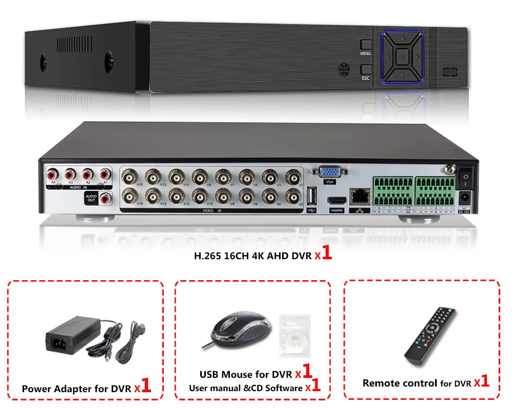 1 х H.265 16CH 4K 6 в 1 AHD DVR гибридный цифровой видеорегистратор;1 x Блок питания для DVR;1 X USB мышь для DVR;1 компакт-диск программного обеспечения для DVR;1 пульт дистанционного управления для DVR;Жесткий диск в комплект не входит!