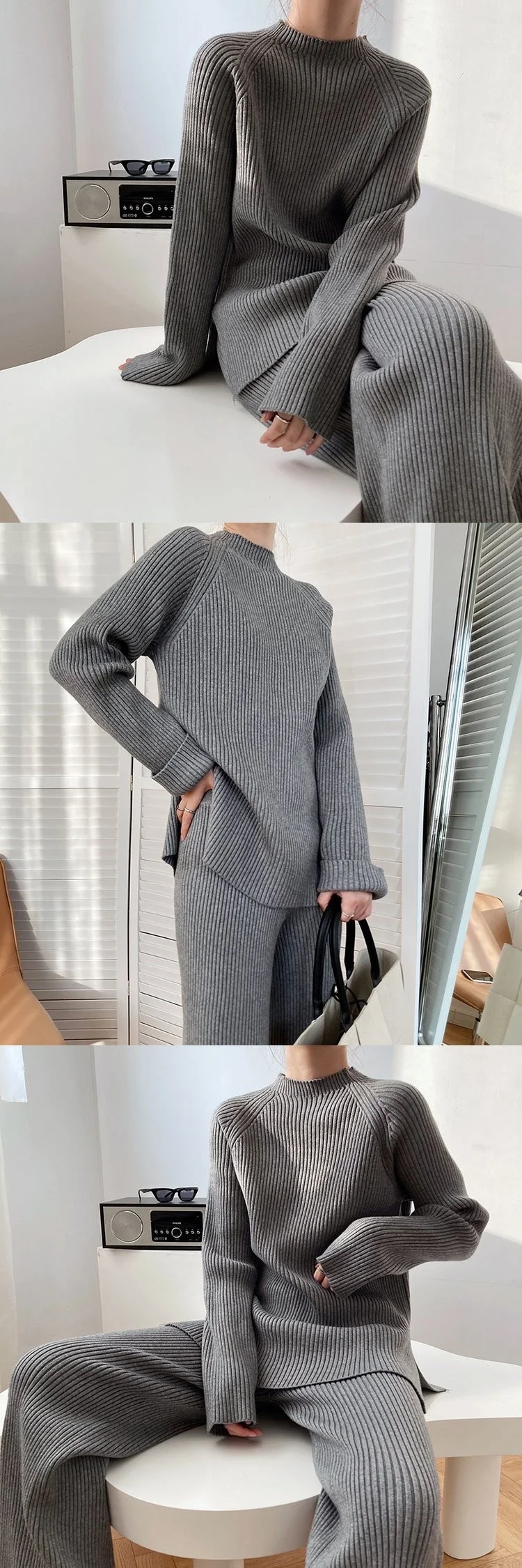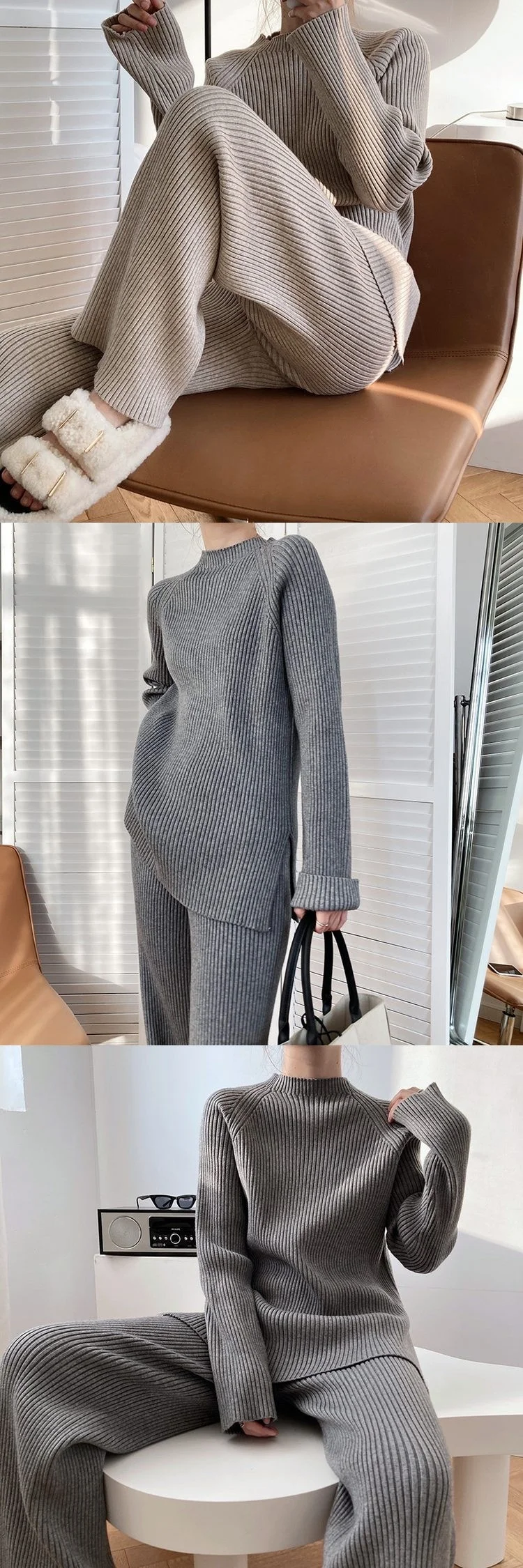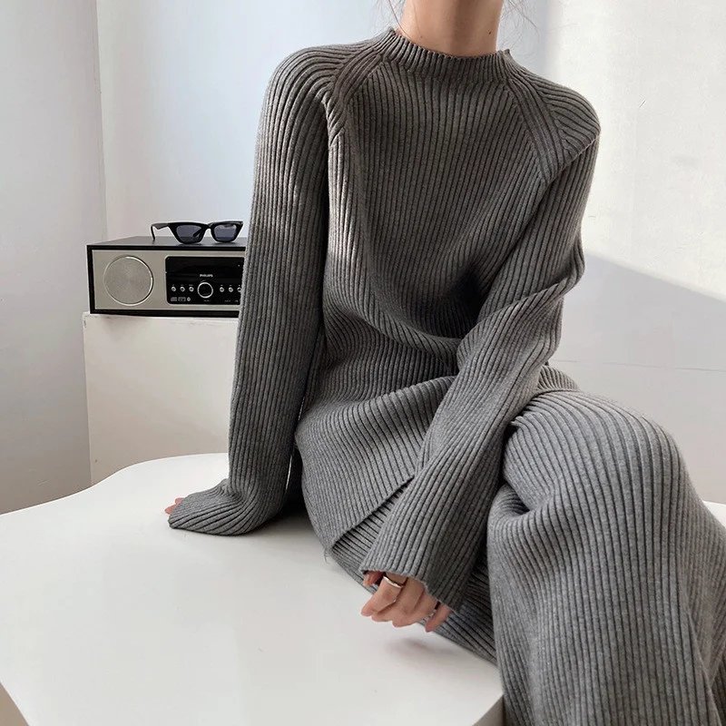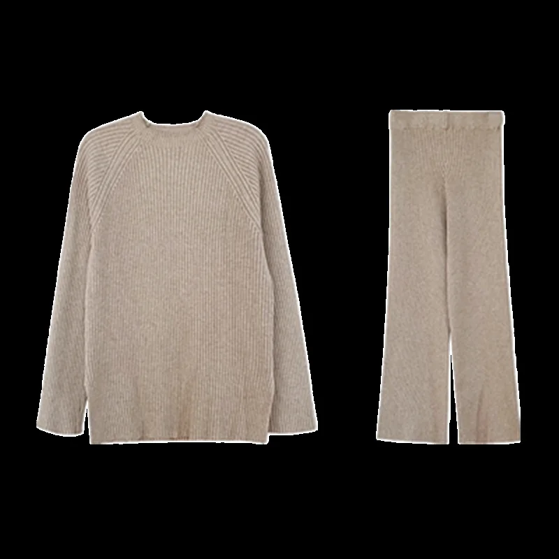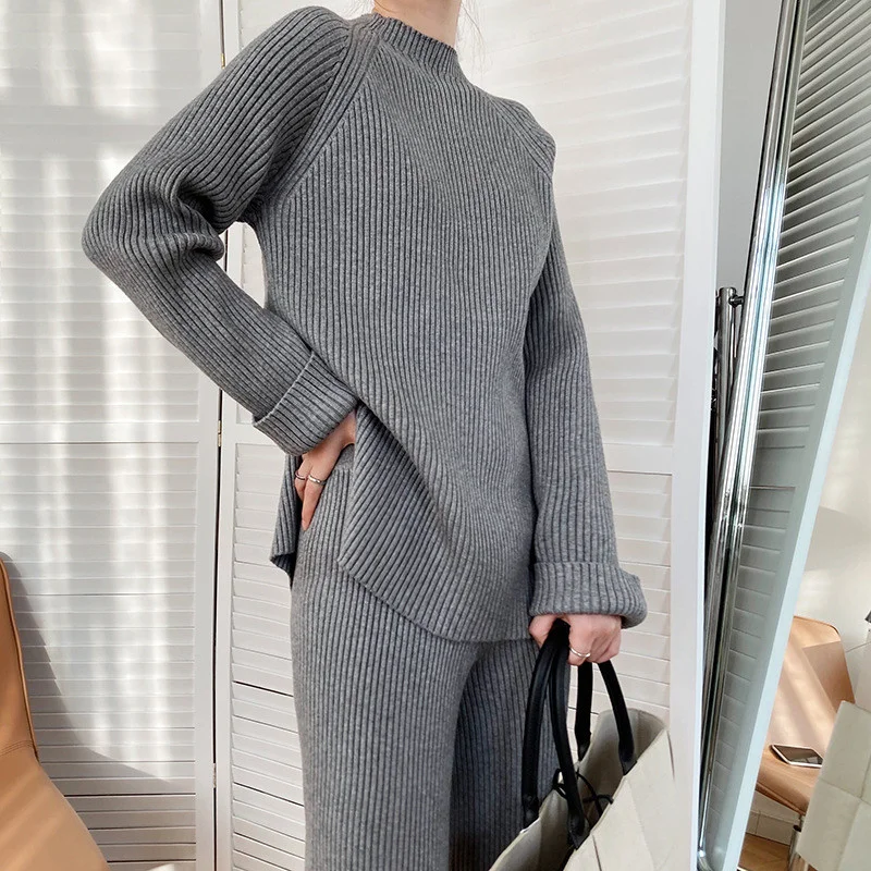 Костюм спортивный из двух предметов, трикотажный, с разрезом по бокам и широкими штанами, Осень-зима