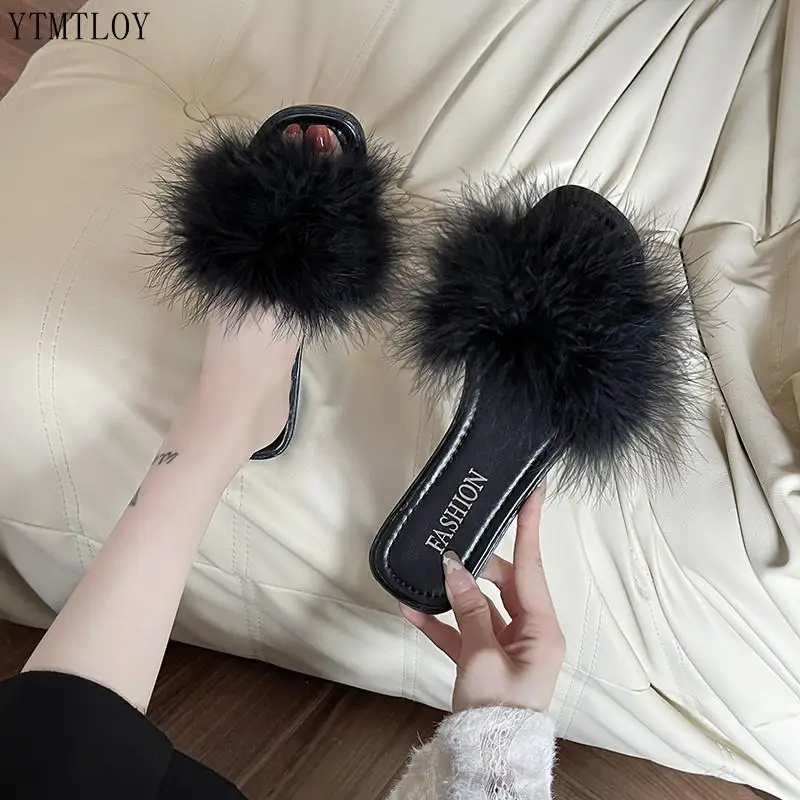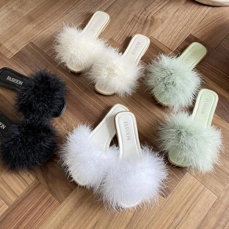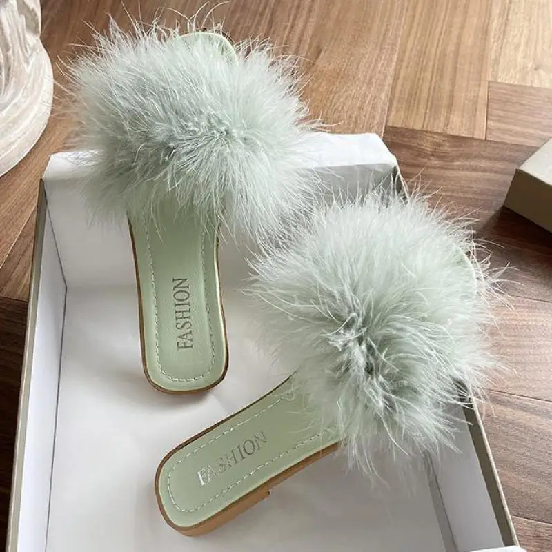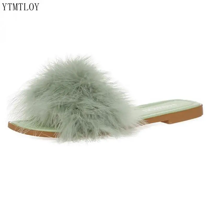 Мюли женские модные, меховые шлепанцы, квадратный носок, плоская подошва, офисные сланцы, плоская подошва, зеленые белые розовые