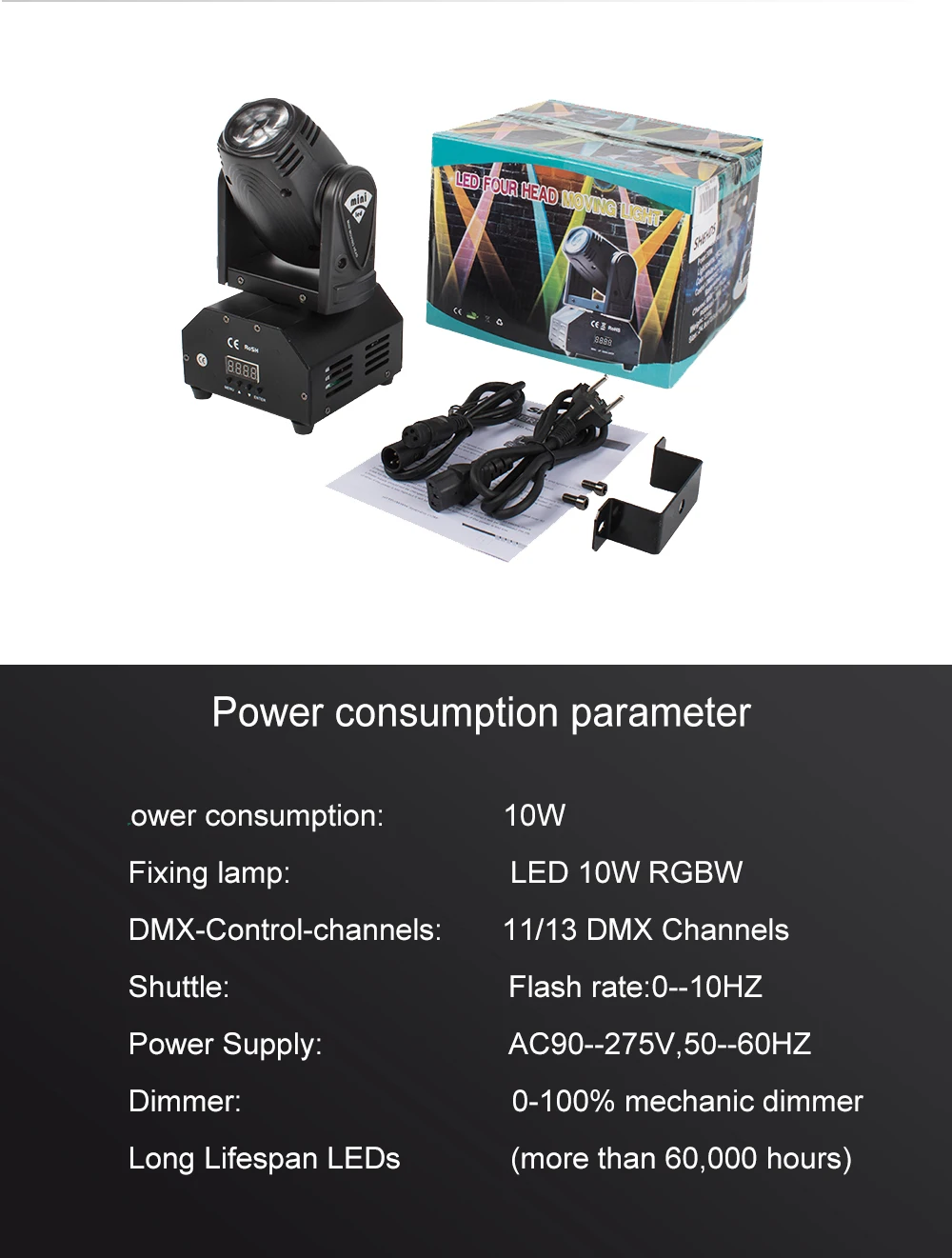 * Режимы управления:DMX512, Авто запуск, звуковое действие, стробоскоп, автономный и мастер/раб, с богатой передовой встроенной программой