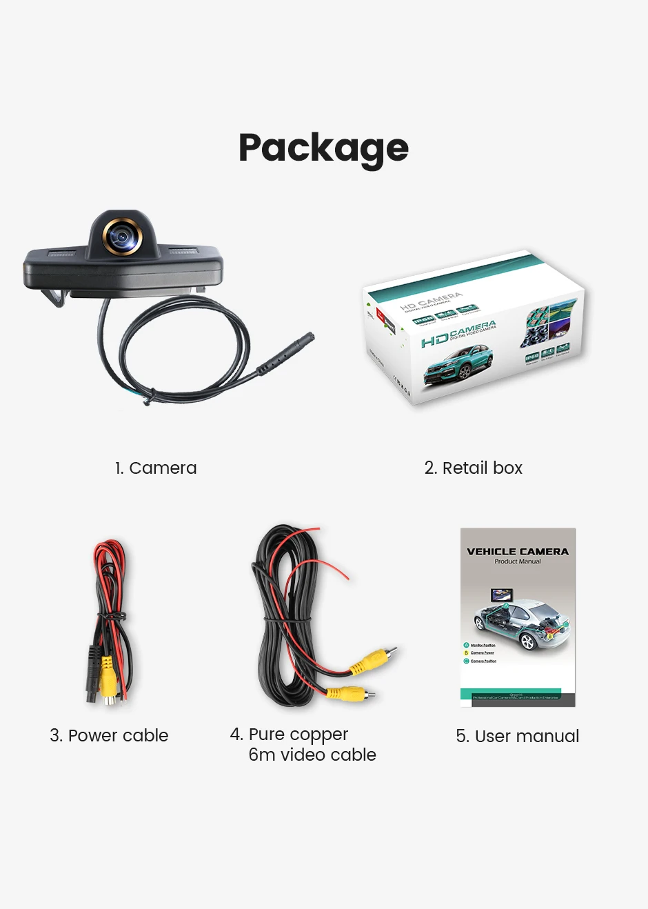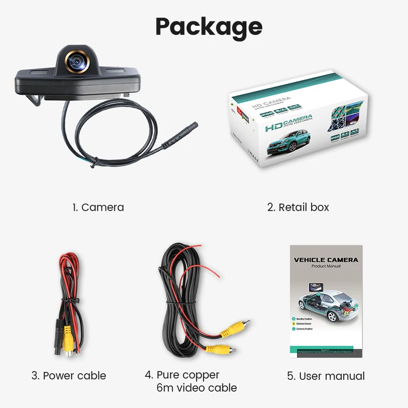 1. Камера заднего вида2. Розничная коробка3. Кабель питания4. Чистый медный 6 м видео кабель5. Руководство пользователя