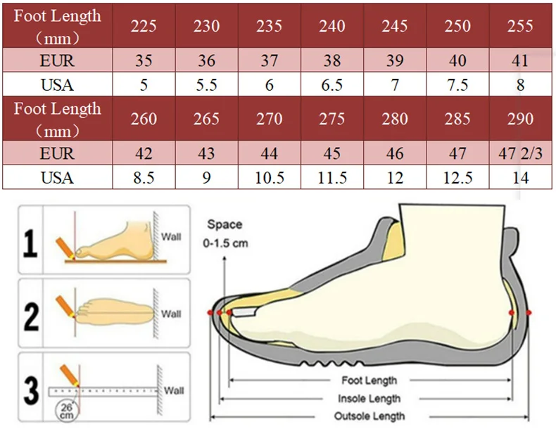 Выберите размер обуви в соответствии с вашимДлина стопы. (Таблица размеров поможет вам решить проблему с выбором размера на 90%.)
