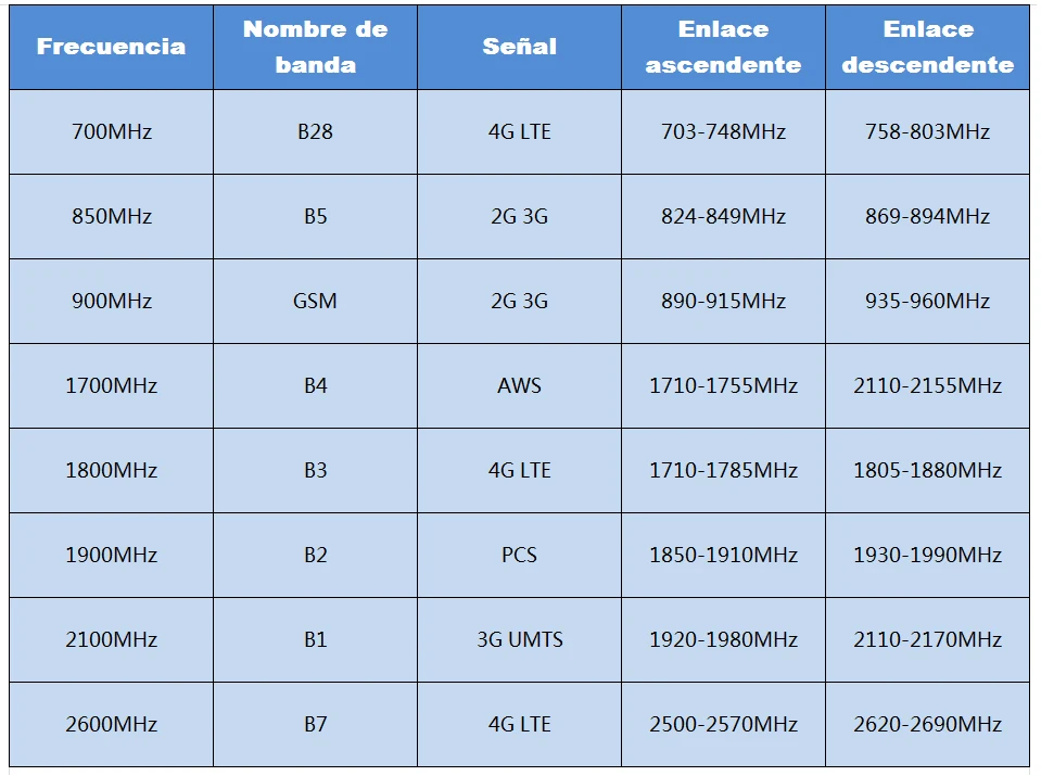Ya no es necesario preocuparse por la frecuencia de la señal. Es un amplificador de señal de cuatro bandas que funciona para 850, 1700, 1900 y 700Mhz / 2600Mhz, que son Band 5, Band 3, Band 2 y Band 28 / Band 7, cubriendo casi todas las frecuencias de señal utilzadas en Sudamérica.
