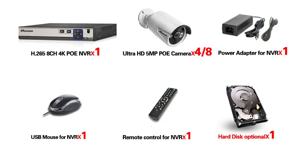1 сетевой видеорегистратор 8CH 4K POE NVR;4/8 X HD POE IP 5.0MP Крытый Открытый ИК камеры дневного ночного видения;1 X Блок питания для NVR;1 х USB мышь для NVR;1 компакт-диск программного обеспечения для NVR;1 пульт дистанционного управления для NVR;Жесткий диск опционально!