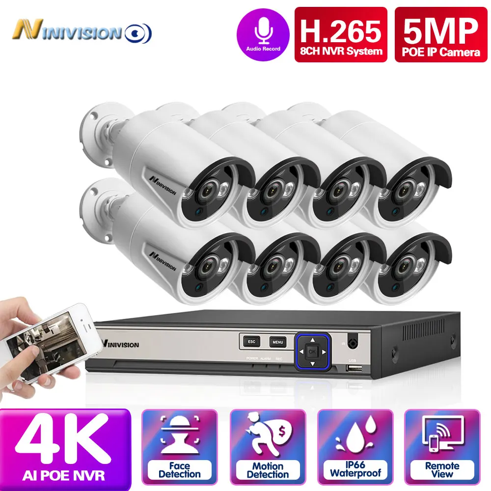 Система видеонаблюдения H.265, 8 каналов, 5 МП, POE, NVR, наружная водонепроницаемая IP-камера с ИИ-обнаружением, с записью звука, комплект для домашнего видеонаблюдения
