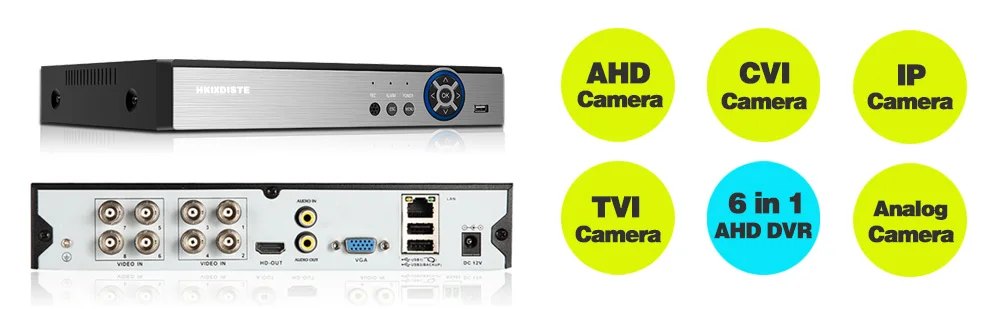 Вы можете свободно наслаждаться шестью режимами подключения с помощью этого многофункционального цифрового видеорегистратора. AHD (аналог высокой четкости)-новая передовая технология домашней безопасности с 6 режимами записи. Для вашего варианта: Аналог/AHD/Сеть/TVI / CVI / AHD + сеть. Вы можете получить видео высокого качества в каждом режиме.