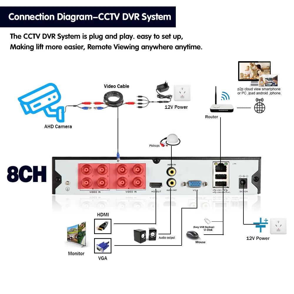Простая настройка, всего 4 шага для просмотра мобильный телефон, просмотра видео в режиме реального времени из любого места и в любое время с помощью смартфона, стола или ПК с передовой технологией P2P, вы можете получить удаленный доступ к вашей системе за считанные минуты или меньше, нет необходимости в переадресации, удаленный доступ никогда не был таким простым!