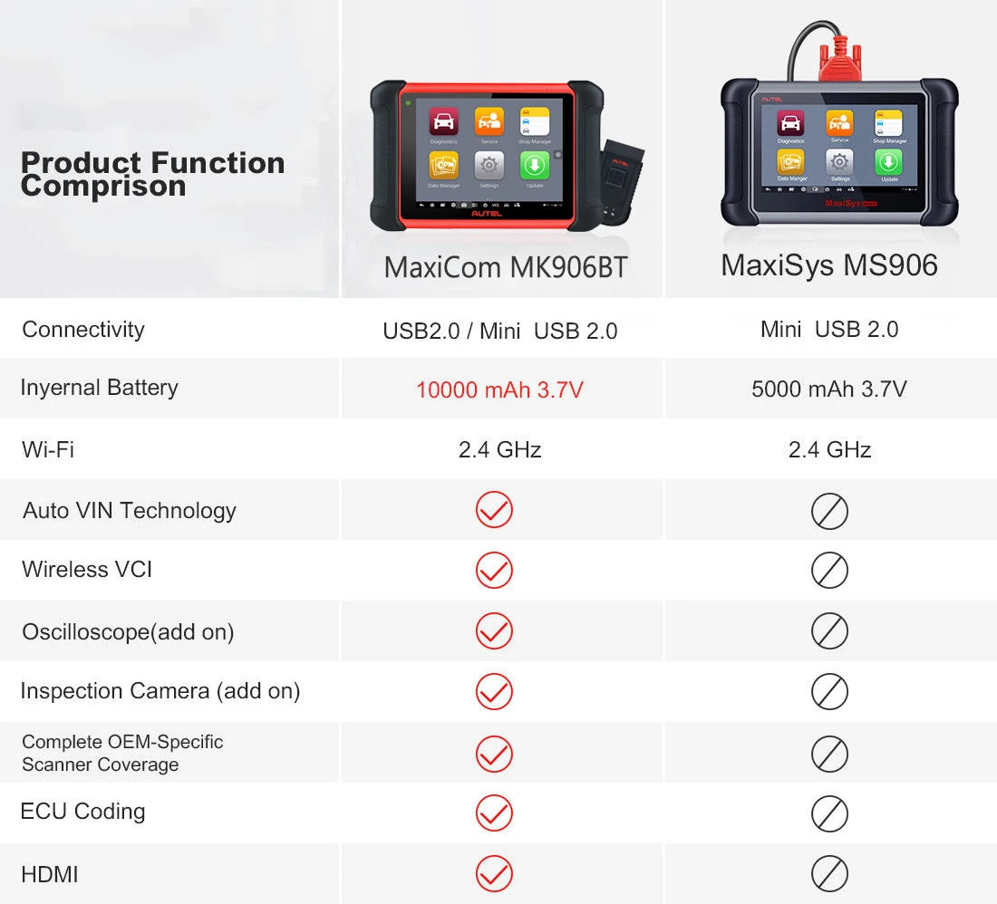 -Autel Maxisys MS906BT имеет некоторые функции, которых MS906 не имеет.1. MK906BT поддерживает передачу по Bluetooth, диагностику по беспроводной сети и большее расстояние для беспроводной связи.2. Диагностическое покрытие MK906BT's включает в себя автомобильные бренды премиум-класса, такие как Maserati и Bentley, которые будут необходимы для высококлассных сервисных магазинов.3. MK906BT поддерживает осциллограф и надстройки цифровой инспекционной камеры, которые не поддерживаются MS906.4. MK906BT может выполнять кодирование для покрытых транспортных средств.5. MK906BT имеет полный OEM-Specifc покрытие сканера!6. MK906BT имеет порт USB и порт HDMI. Кроме того, MK906BT имеет двойной размер батареи MS9067.MK906BT поддерживает несколько языков, в то время как MS906BT поддерживает только английский!