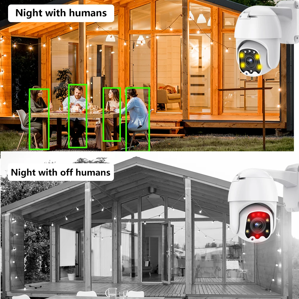 Гуманоидное оповещениеDefult будет черно-белым ночным видениемКогда человек входит в зону камеры, светодиодный индикатор будет белым, а изображение камеры будет иметь цвет.