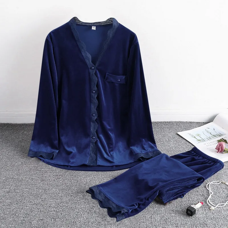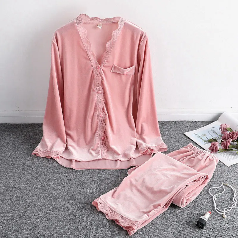 Пижамный комплект Женский, бархатный, с V-образным вырезом, кружевной топ и штаны, однотонный, Осень-зима
