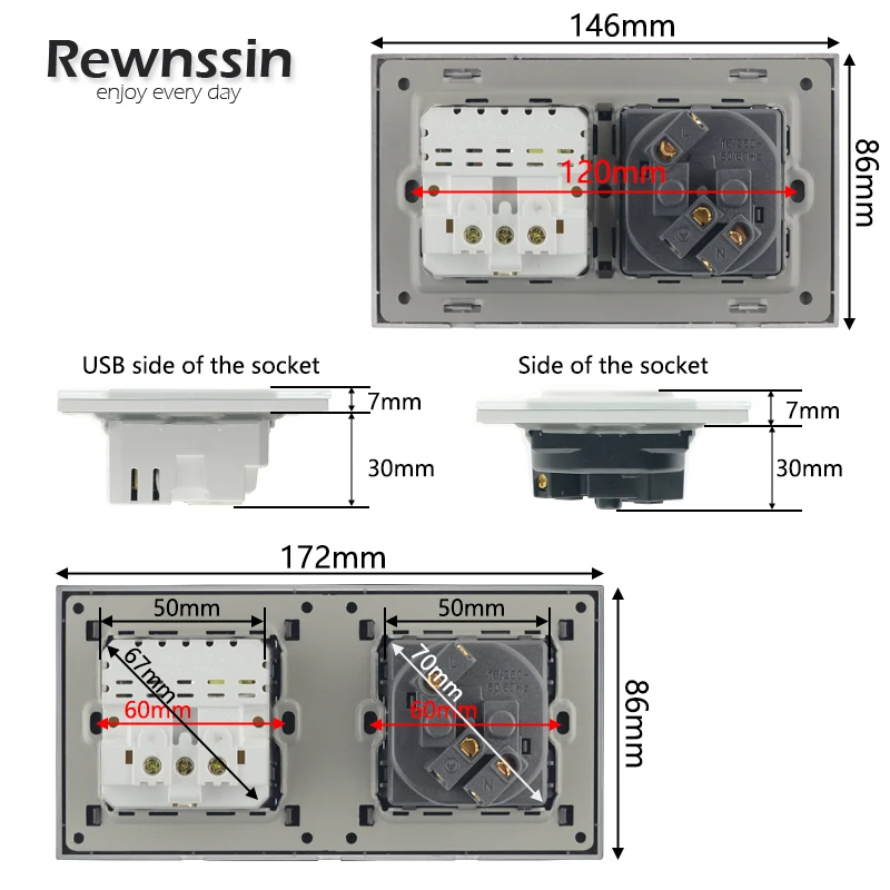 1. Цвет: белый2. Номинальное напряжение (ы): 250 В переменного тока/50 Гц3. Номинальный ток: 16A4. Ток USB: 5 в 2,1 А5. Обеспечение заземления: с заземлением6. Степень защиты от электрического удара: с повышенной защитой7. Размер переключателя (Д * Ш):Гнездо Singel: 86 мм * 86 ммДвойная розетка: 172 мм * 86 ммТройник: 258 мм * 86 ммЧетырехместный разъем: 344 мм * 86 ммПосылка включает в себя:1 х настенная розетка2 x винт