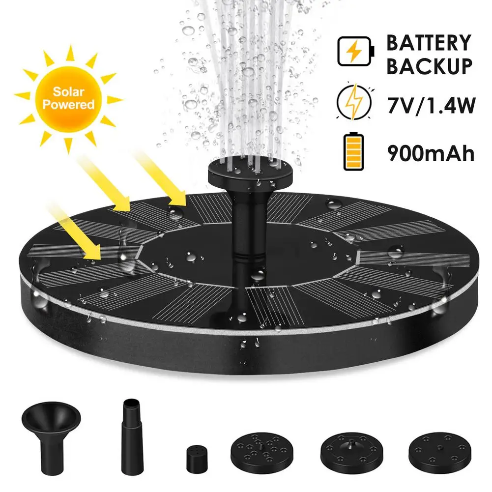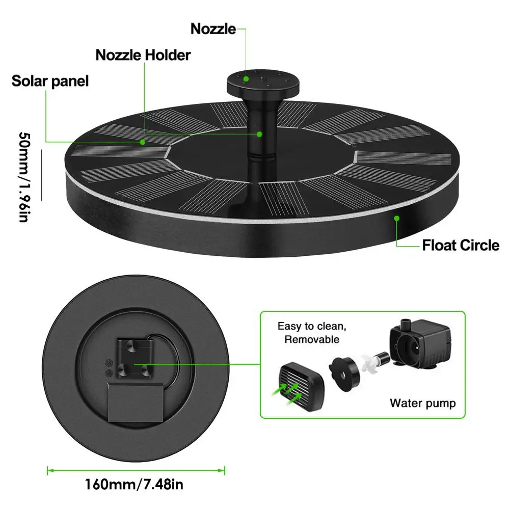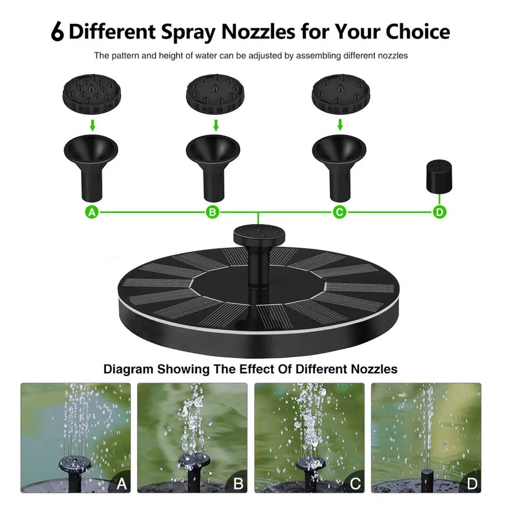 Особенности:1. Обновленная версия солнечной спрей: отличается от общего 1,4 Вт фонтан на рынке, наш фонтан ламинированная с домашним животным, который имеет более высокую эффективность преобразования и длительный срок службы. Солнечная панель не легко ломается под несколькими месяцами солнечного света.2. Защита окружающей среды: на солнечной энергии, без батареи или источника питания. Пусть фонтан держаться на поверхности воды (примерно 2 дюймов (примерно 5,1 см). Глубина по крайней мере). Если есть солнечный свет, он будет автоматически работать в течение 3 секунд.3. 7V/1,4 W панели солнечных батарей: использование более эффективный безщеточный насос и 1,4 Вт солнечных панелей, мощность сильнее и распыления воды для лучшего эффекта. Даже при отсутствии достаточного солнечного света часть тени может использоваться на солнечных батареях.4. 4 насадки: Этот набор солнечных водяных насосов оснащен 4 насадками, что позволяет выбирать различные режимы воды по желанию. Или вы можете удалить сопло с солнечного фонтана, чтобы предотвратить брызги воды.5. Многоцелевое использование: очень подходит для уличных птиц, аквариумов, небольших прудов, садовых птиц, бассейнов, циркуляции воды, увеличения pH воды и т. д.Характеристики:Солнечная панель: 7V 1,4 WМодель насоса №: BP200Максимальный расход воды: 150 л/чПроцесс: Ламинирование ПЭТДиаметр: около 16 см/6,30 дюймаНасос Выход: DC 4,5-10VМаксимальная высота распыления: 40 смИнструкции:1. Так как на эффективность солнечной панели влияет светильникИнтенсивность, эффект распыления воды фонтана также влияетПогодные условия, сезонные изменения, географическое расположениеИ тому подобное.2. Часто чистите солнечную панель.3. Как насос сломается, если холостой ход в течение 2 часов или блокируетсяВ течение 2 дней, пожалуйста, устраните ошибки (Добавьте воду или очиститеНасос) вовремя. Для товаров без холостого хода и Блокирующей защиты,Устранение неисправностей в течение 2 часов; Для элементов с холостым и блокирующимЗащита, устранение неисправностей в течение недели.4. Держите воду чистой и регулярно чистите насос (предлагаемОдин раз в месяц).5. Будьте осторожны с острыми частями. Не позволяйте детям использовать этот продукт.Упаковочный лист:1 * Солнечный фонтан6 * аксессуары для фонтана