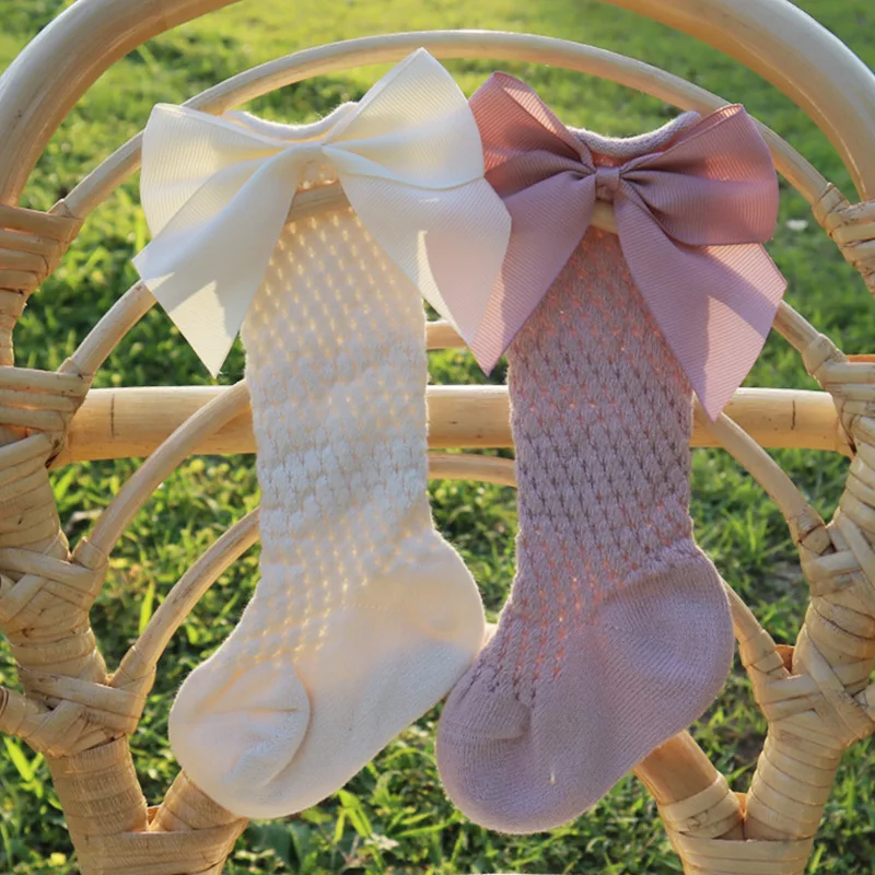 Детские носки для девочек, сетчатые носки в испанском стиле для малышей длинные мягкие хлопковые детские носки до колена с большим бантом 2021 весна-лето