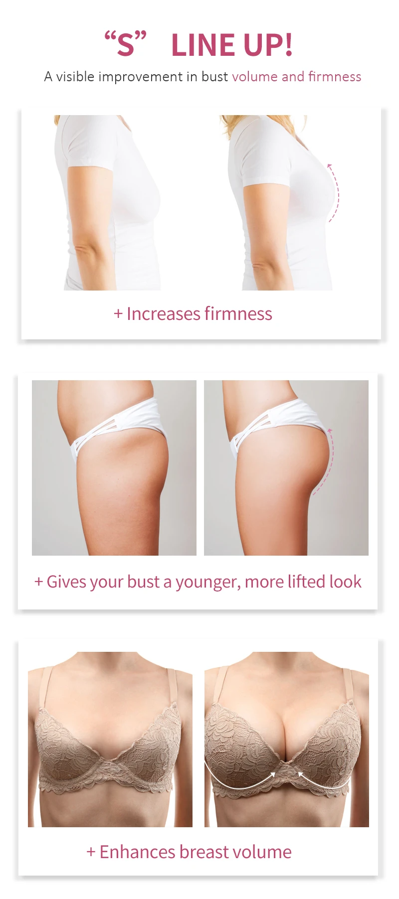 Помогает укрепить и улучшить грудь и ягодицы с эксклюзивным комплексом активных и натуральных ингредиентов. Его подъемное действие может мгновенно затянуть ткань груди и бедер, помогает эффективно бороться с гравитацией, обеспечивает эластичность и поддержку.