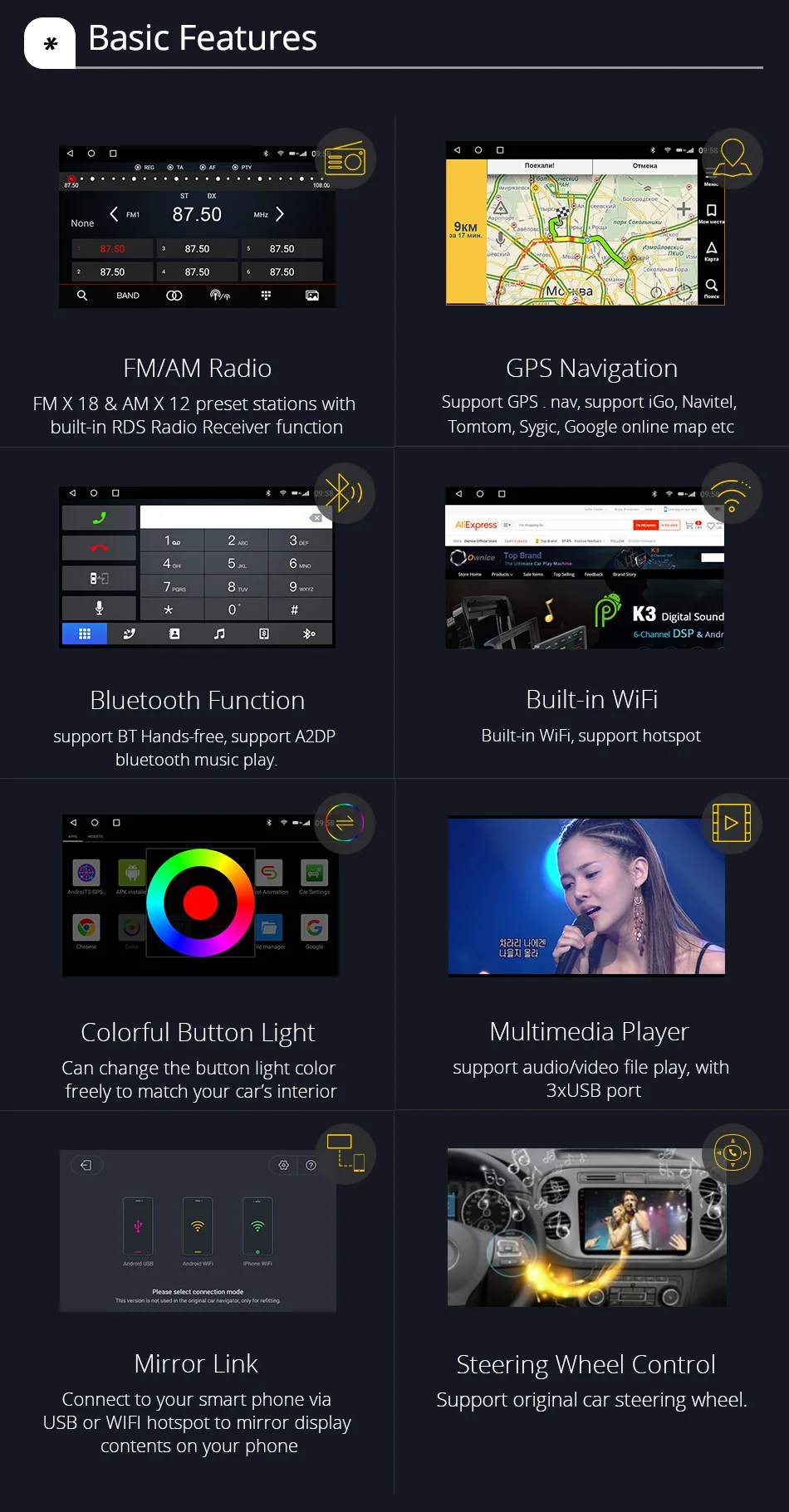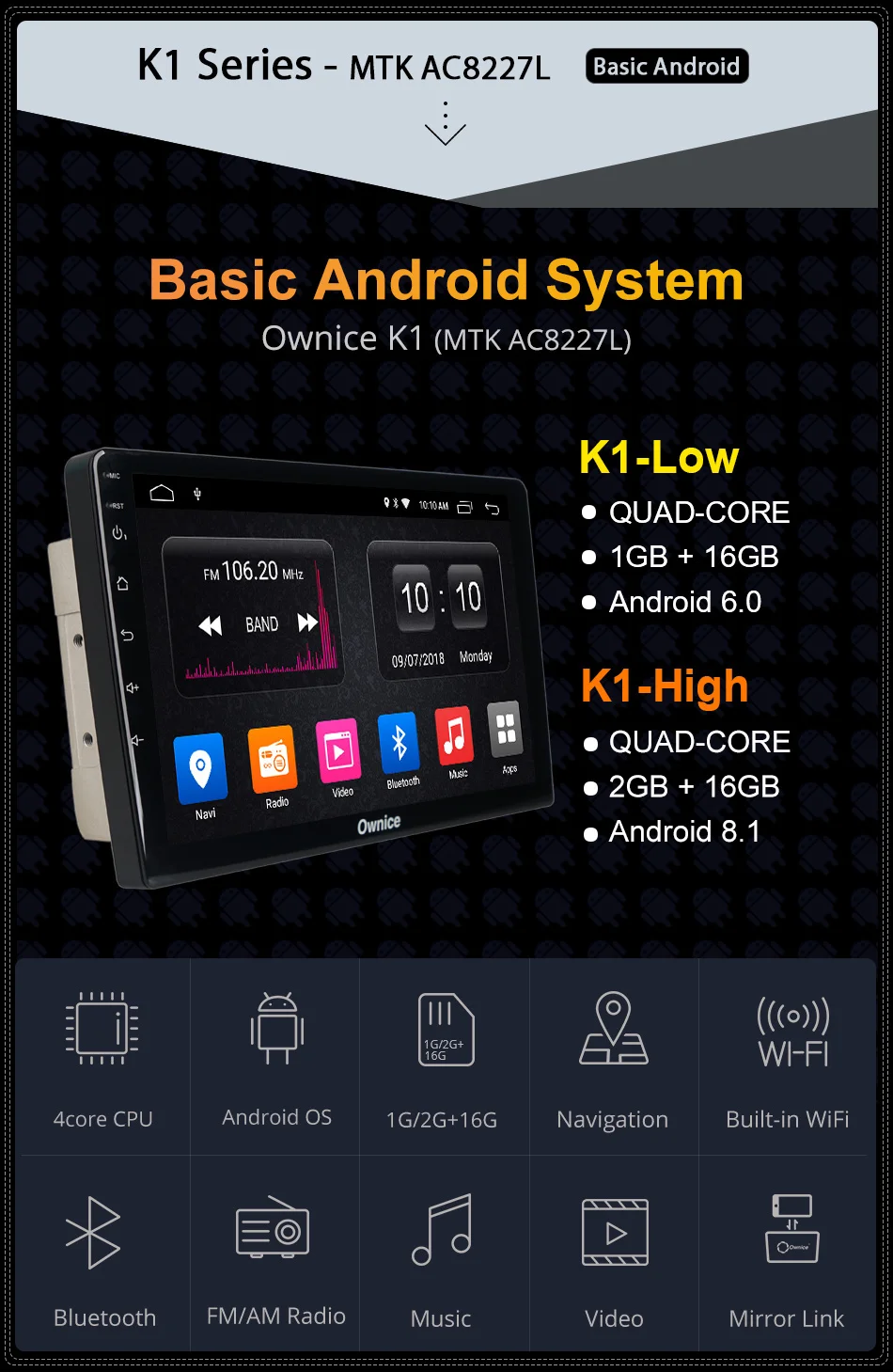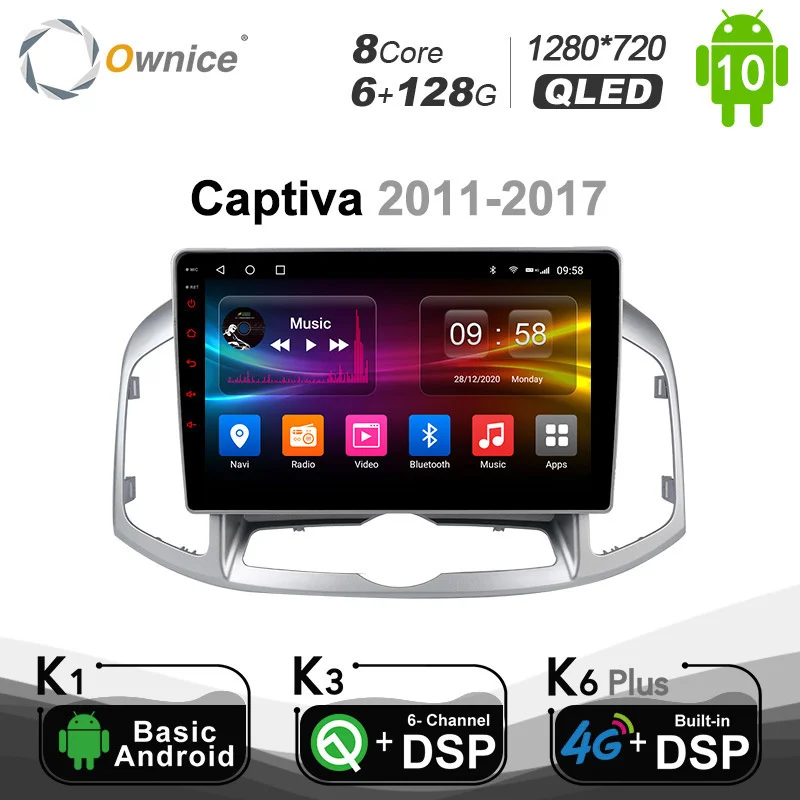 Ownice Android 10,0 8 ядерный Автомобильный DVD стерео для Chevrolet Captiva 2011-радио GPS Navi мультимедиа аудио DSP 4G SPDIF 6G + 128G Подходит для Для Chevrolet Captiva 2011- Если оригинальное автомобильное радио имеет функцию ниже, совместим ли блок Ownice Head? * Управление рулем --- да* Орингинальный радар или датчик парковки --- да* Отображение информации о состоянии воздуха, состояние открытия двери, настройка автомобиля --- да* Оригинальная AUX / USB/обратная камера --- Да, поддержка Внимание: Приведенная выше информация только для справки, иногда она может не быть совместима с некоторыми автомобилями, потому что автомобили производятся в разных странах в разных летних вариантах, спасибо за понимание. K6 Plus 128G ---UIS7862| Android 10,0 |8 ядер (A75 * 2 + A55 * 6) | 6G + 128G | 2.5D + IPSQLED 1280*720 | Радио 7708 | Усилитель 7851L K6 Plus 64G ---UIS7862| Android 10,0 | 8 ядер (A75 * 2 + A55 * 6) | 4G + 64G | 2.5D + IPSQLED 1280*720 | Радио 7708 | Усилитель 7851L K6 Plus 32G ----UIS7862| Android 10,0 | 8 ядер (A75 * 2 + A55 * 6) | 3G + 32G | 2.5D +IPS QLED 1280*720 | Радио 7708 | Усилитель 7388 K3-PX5 ------ PX5 | Android 10,0|8 ядер | 2G + 32G | 2.5D + TN1024*600 | Радио 7708 | Усилитель7851л K3-PX6 ------ PX6 | Android 10,0 | 6 ядер (A75 * 2 + A53 * 4)| 4G + 64G | 2.5D +IPS 1280*720 | Радио 7708 | Усилитель 7851LK1-Low ------- AC8227L | Android 6,0 | 4 ядра| 1G + 16G | 2.5D + TN 1024*600 | Радио 7786 | Усилитель 7388K1-High ------ AC8227L | Android 8,1 |4 ядра | 2G + 16G | 2.5D + TN 1024*600 | Радио 7786 | Усилитель 7388