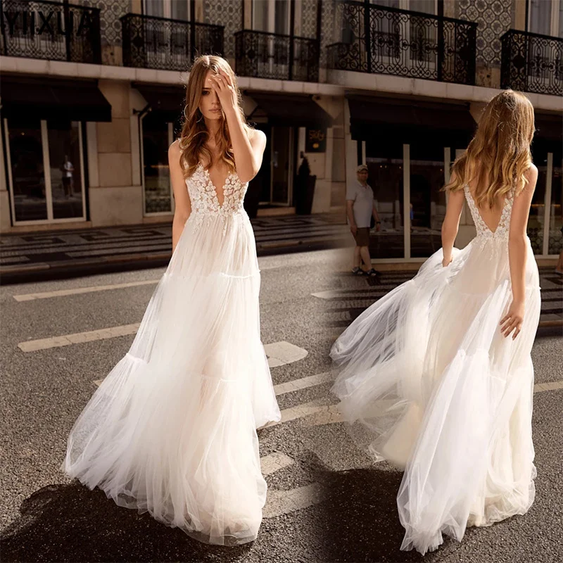 Винтажное Тюлевое сексуальное летнее кружевное ТРАПЕЦИЕВИДНОЕ длинное свадебное платье YiXuan с круглым вырезом без рукавов с аппликацией и открытой спиной для торжественных случаев 2021