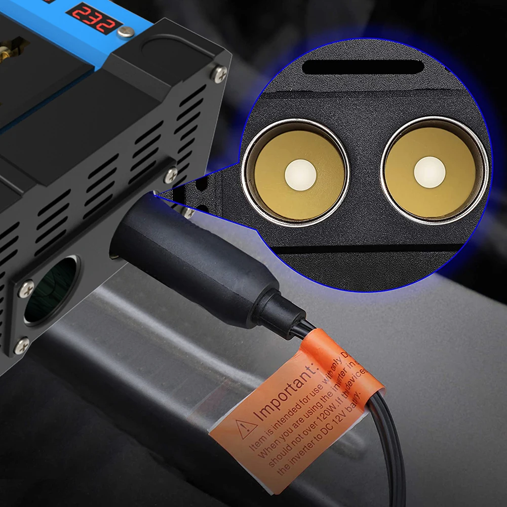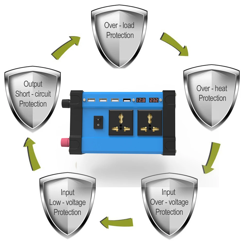 * 4. [Мульти Защита] Встроенные предохранители, 8-ступенчатая защита и охлаждающий вентилятор предотвращают перегрев автомобильного инвертора, перенапряжение, перегрузку, перегрузку по току, короткое замыкание, пониженное напряжение, перегрев.