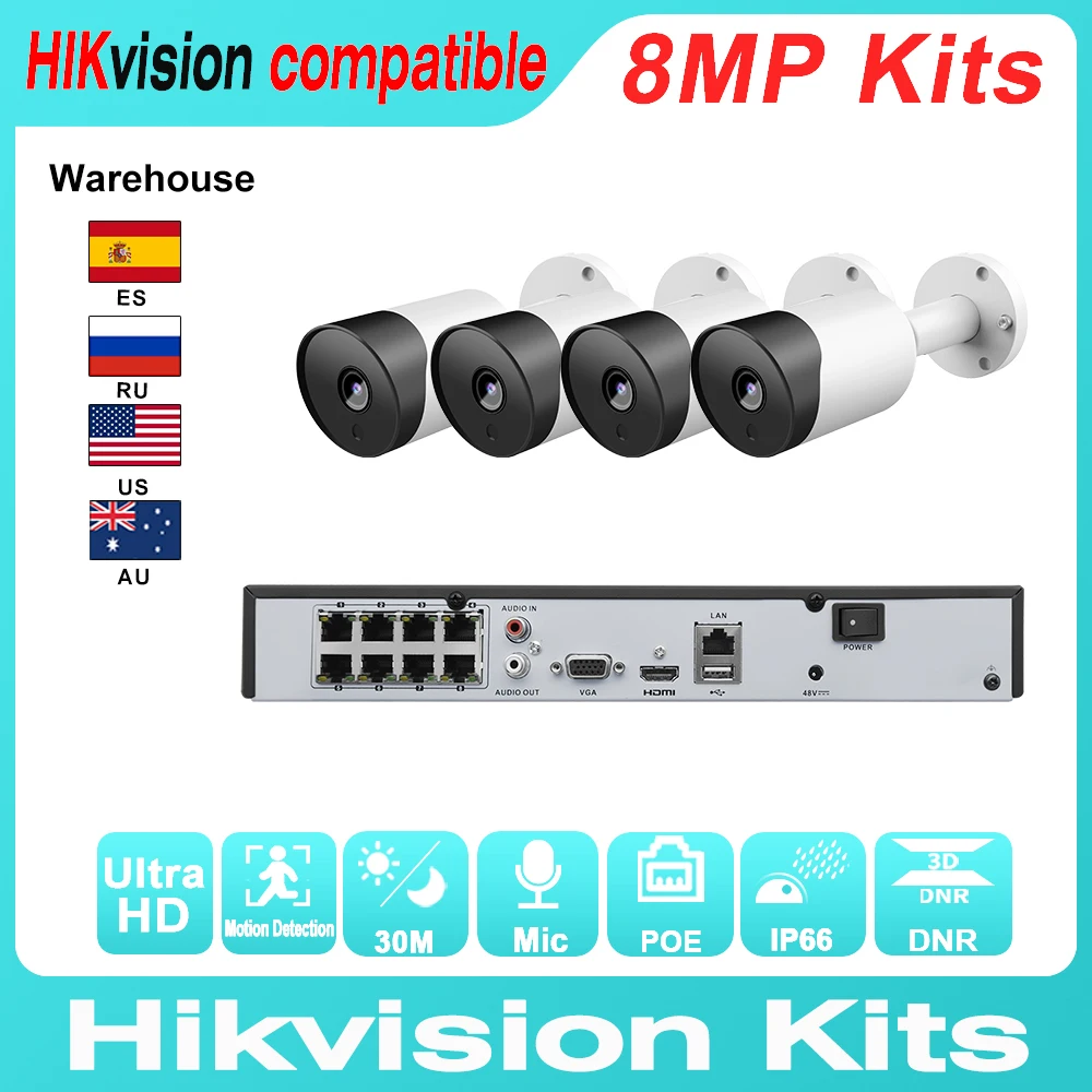 Hikvision совместимые наборы IP Bullet Camera 4K 8MP 4 шт. Встроенный микрофон IR + Hikvision оригинальный NVR DS-7608NI-Q18P POE CCTV System