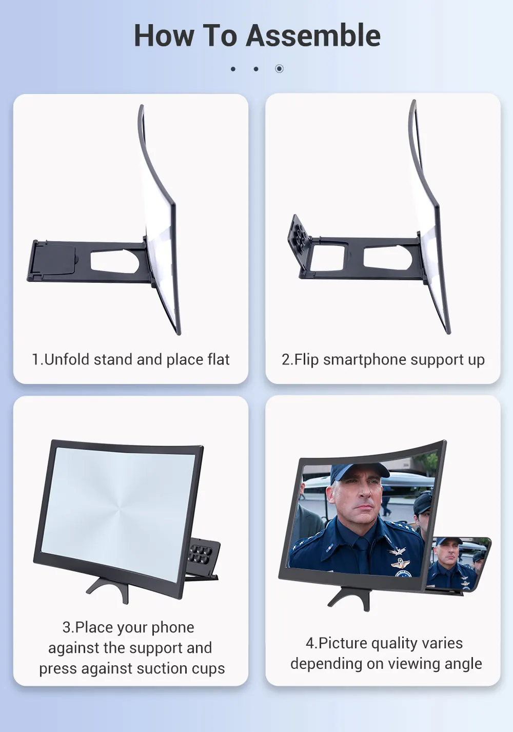 [Складной дизайн]: HD экран увеличитель тип хранения вращающийся складной дизайн. Если высота недостаточно, высоту можно регулировать с помощью кольцевой подставки. Супер тонкий в сложенном виде, а также можно носить в сумке. Подходит для дома, кемпинга, путешествий, отдыха, в любом месте и т. д.