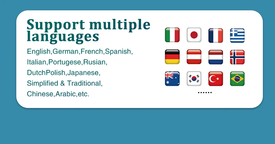 > Поддержка нескольких языков: китайский (упрощенный), русский, испанский, турецкий, русский, иврит, итальянский, китайский (традиционный), арабский, французский, немецкий, английский, португальский, японский и т. Д.