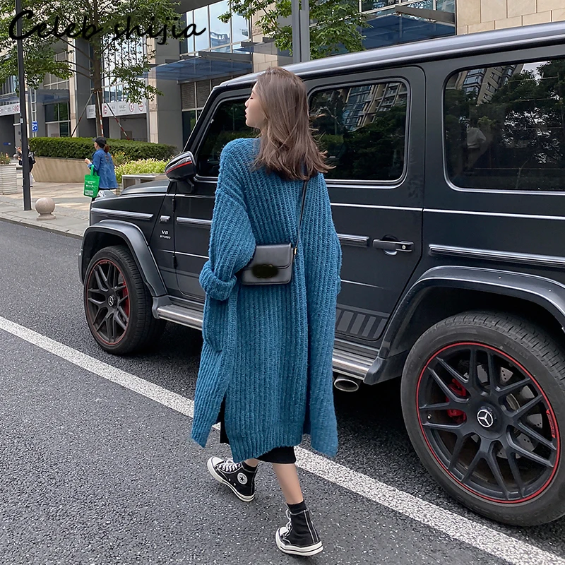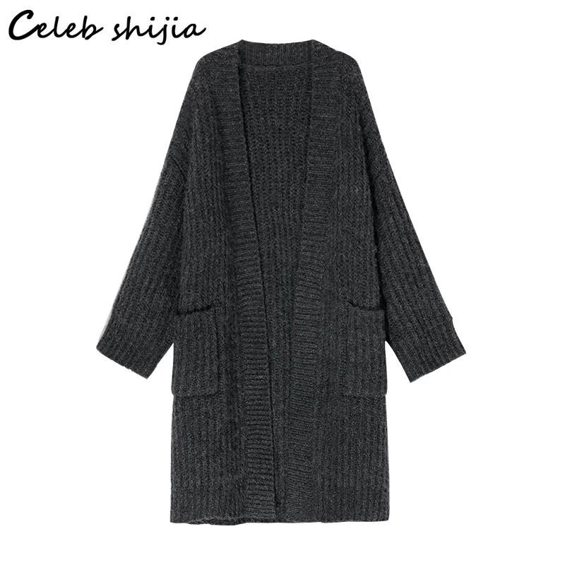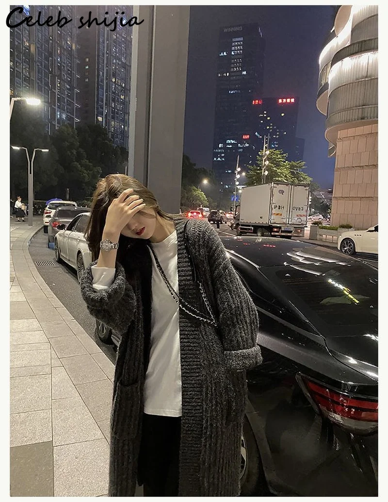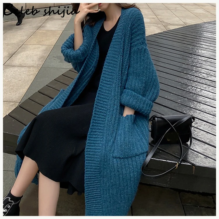 Женский длинный вязаный кардиган SHIJIA, синий утепленный корейский свитер с длинным рукавом, Серый кардиган большого размера на осень и зиму