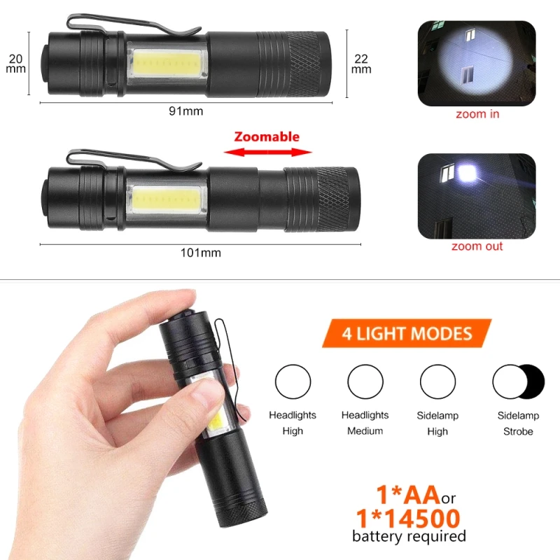 1. Для повседневного использования, для высоких и низких лучей и одиночного ручной Управление: Длина только 9,3 см, Вес только 35 г, легко управлять одной рукой, зажим, можно прикрепить к шляпе, рюкзак, сумки из натуральной кожи, с ремешком, и т. д., идеально подходит для повседневного ношения.2. Наиболее часто используются d и практичные: часто покупают громоздкий большой фонарик и редко используют. Иногда нам просто нужен портативный светильник ярче, чем вспышка для мобильного телефона (вспышка для мобильного телефона вредна для глаз), тем более важно, что светильник с вами и может использоваться прямо сейчас.3. Многофункциональный: светодиодный Q5-XPE ярче, но экономит больше энергии; Светильник COB может предложить широкий светильник на 360 °. 4 режима Full Bright, Low Bright (режим энергосбережения), sideamp Full Bright, sideamp SOS готовы ко всему. Универсальный, как велосипедный светильник, фонарь для палатки, фонарь светильник, аварийный светильник, хорошо подходит для охоты, езды на велосипеде, кемпинга, активного отдыха.4. Прочный и надежный: оптимизированный корпус из алюминиевого сплава, противоскользящий захват и высокий уровень водонепроницаемости IPX-6 для влажных погодных условий.Премиум черный чехол идеально подходит в подарок. Отличная идея подарка для ваших близких. Источник питания: 1 * AA батарея (не входит в комплект) или 1*14500 батарея. (не входит в комплект)