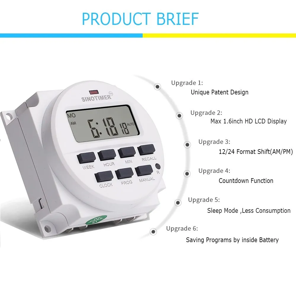 Используйте таймер для включения/выключения любого электрического оборудования на предустановленном таймере 16 программ ВКЛ/ВЫКЛ в день, 15 комбинаций в неделю. Программируемый 24 часа в сутки, 7 дней в неделю. Встроенный аккумулятор может резервного копирования памяти при выключении питания (сохранить программу, которую вы установите) Еженедельная Автоматическая коррекция ошибки времени +/- 30 секунд Легко читаемый ЖК-дисплей, светодиодный индикатор