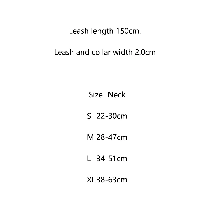 Поводок длиной 150 см.Ошейник и поводок ширина 2,0 смРазмер шеиS 22-30 смМ 28-47 смL 34-51 смXL 38-63 см