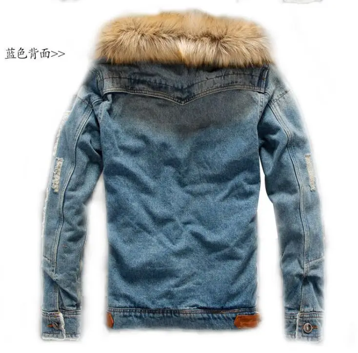 Мужская джинсовая куртка с меховым воротником, Мужская рваная джинс...