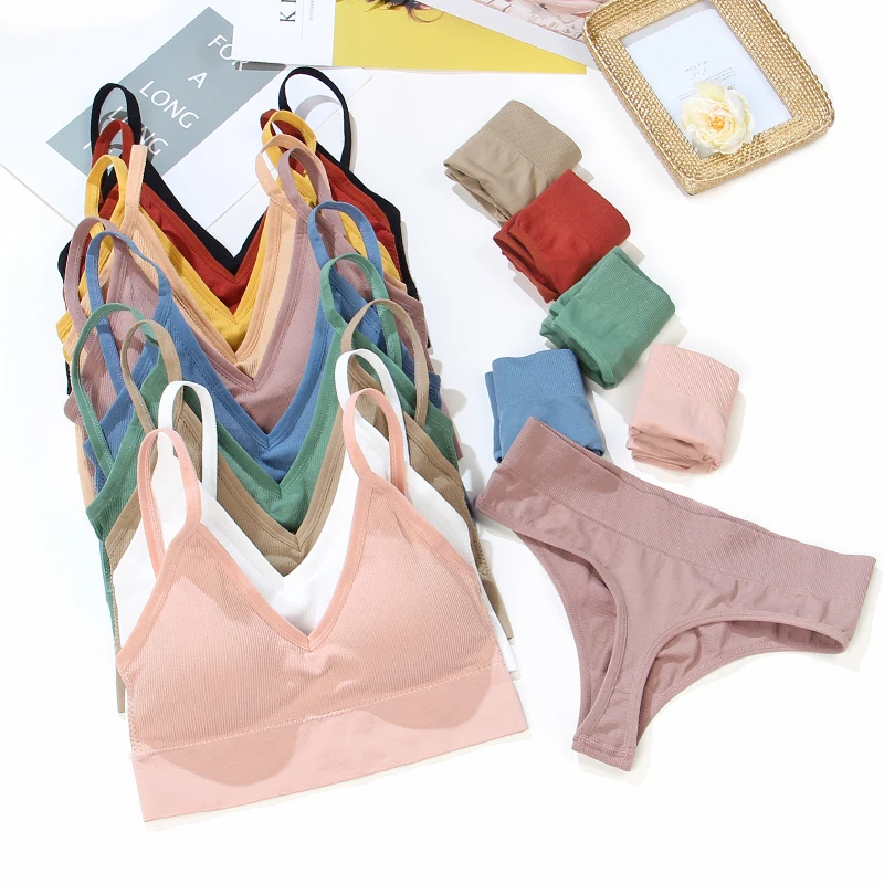 Трусы-стринги женские, хб, бесшовные, бюстгальтер с вкладышами пуш ап