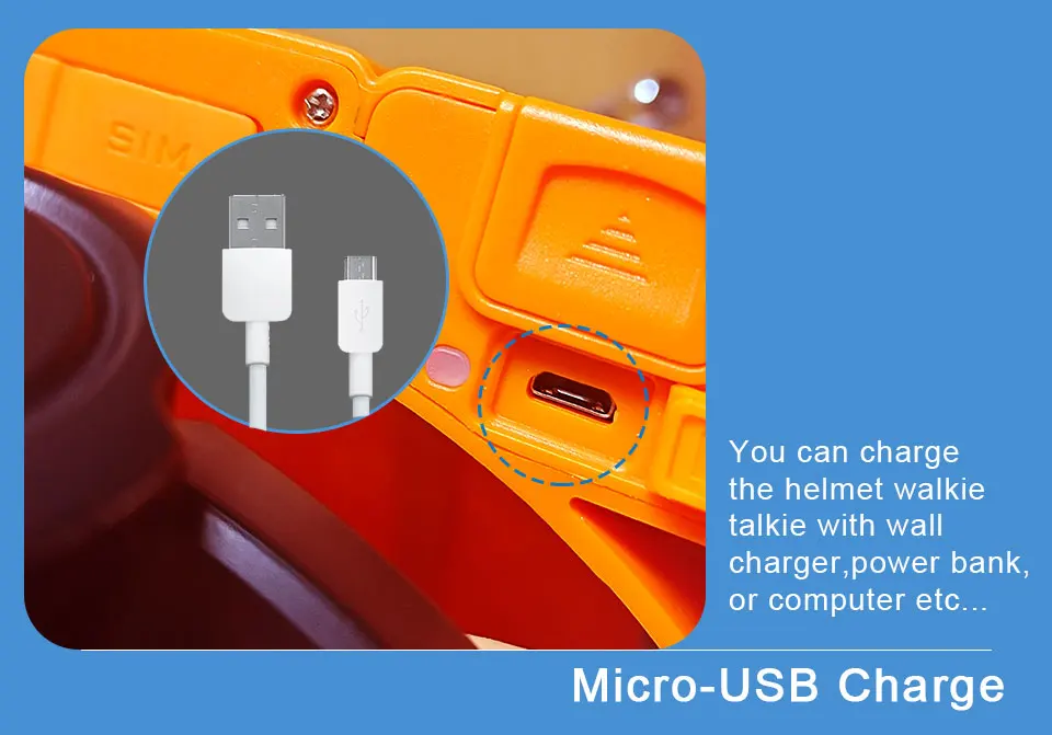 Вы можете заряжать шлем walkie talkie с настенным зарядным устройством, внешним аккумулятором или компьютером и т. Д.
