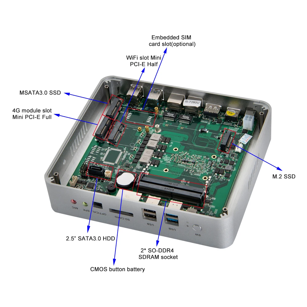 4)-тройное Хранение: Поддержка 1 * Msata SSD + 1 * M.2 NVME(22x80) SSD + 1*2,5 ''SATA SSD/HDD;