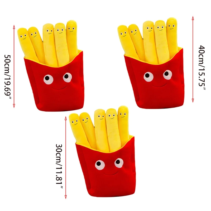 Lovely Soft Plush Doll Cartoon Simulation Fries Throw Pillow Decoration for House Office Plush Toy Stuffed Chair Cushion D5QAOOTDTY Features: 100% brand new and high qualityCute food simulations: Cute and soft plush fries,each one can be taken out individually to smooth your angry or anxiety, when you are busy working or studying hard, you will feel very comfortable and can effectively decompress.Express Emotions: The plush fries doll has lovely cartoon design,surface is super soft, easy to kill off your boring time through holding it in your hugs.Qualified Material: The cartoon plush toy is made of durable plush material and is filled with soft material, which is safe, non-toxic and does not easily lose its fluffiness, color are bright and has a pleasant feel.Soft Design: Soft sewing stuffed plush design and lovely bright color cartoon funny face for kids or adults to play with or just for office house ornaments. Wide Range Application: Soft and cartoon design offers you comfortable experience, perfect for playing, collecting and cuddling, it can be the cushion, throw pillow, back cushion,this is a great children's toy, birthday gift, Valentine's Day gift, Christmas gift. Specification: Material: CottonColor:As Picture ShownHeight A: Approx. 30 cm/11.81 inchHeight B: Approx. 40 cm/15.75 inchHeight C: Approx. 50 cm/19.69 inchPackage Includes: 1x Fries Stuffed Pillownote: Please allow 1-2cm errors due to manual measurement, make sure that you do not mind before you order. Due to the difference between different monitors, the picture may not reflect the actual color of the item.