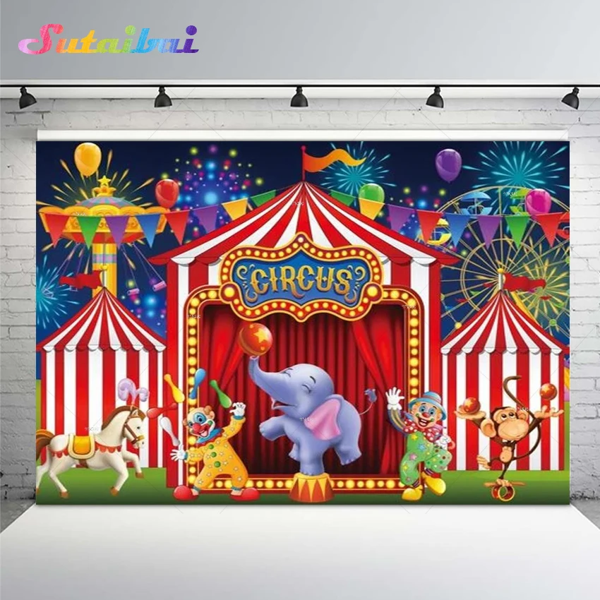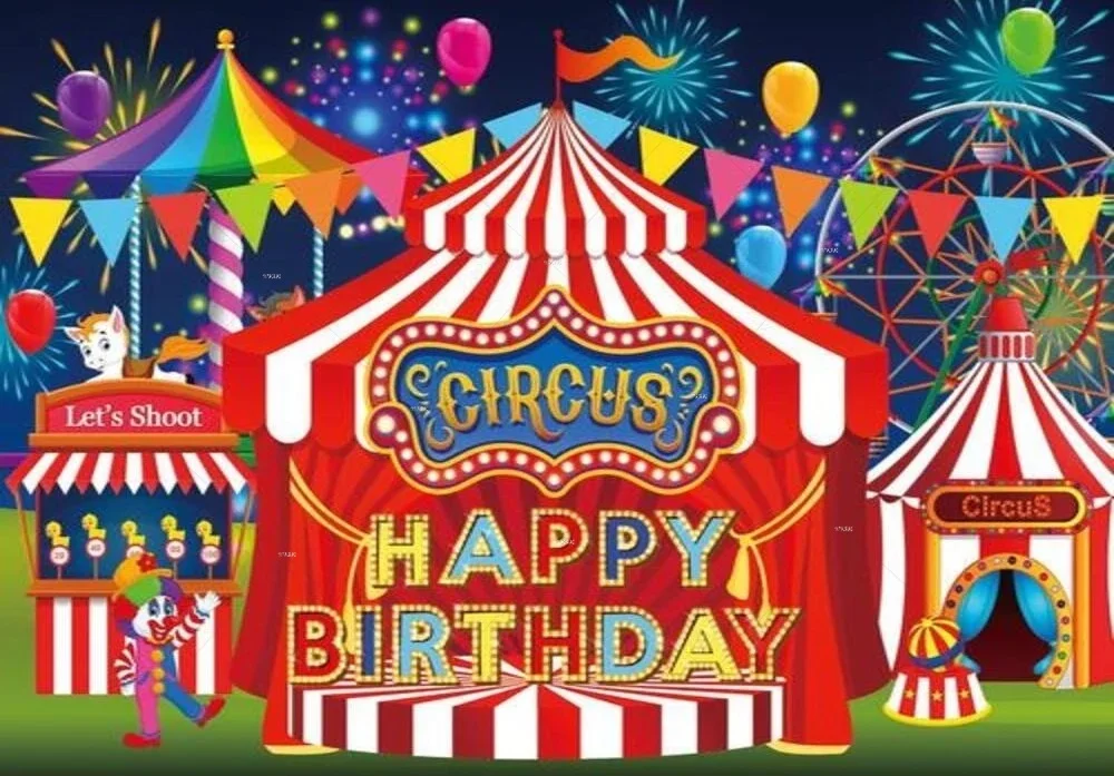 Цирк День Рождения Вечеринка фон животные клоун шоу палатка карнавал фестиваль фейерверк празднование колеса обозрения детский душ фон