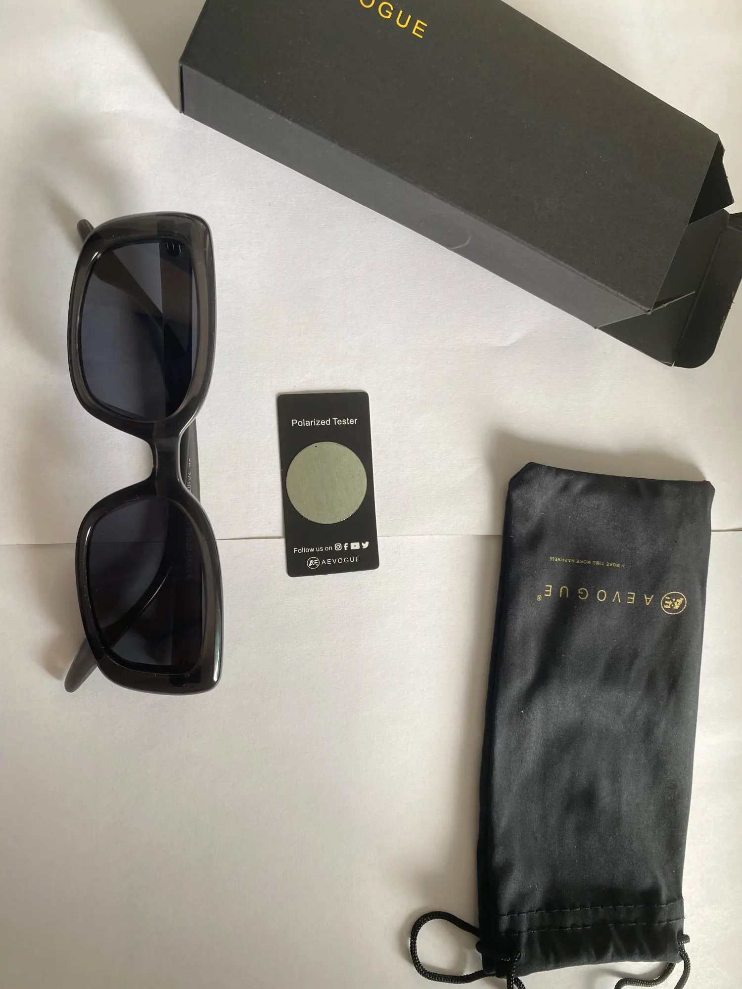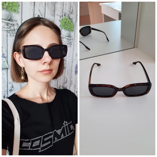 Женские солнцезащитные очки AEVOGUE. Дизайнерская прямоугольная оправа . Очки очень удобные, не жмут. Качественно сделаны, прочный пластик, линзы поляризованные. В комплекте идёт тест на проверку поляризованных линз , мешочек Выглядят очень стильно. Буду носить с удовольствием .