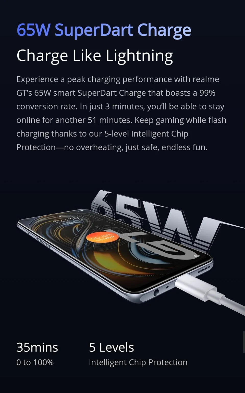 Наслаждайтесь максимальной производительностью зарядки с realme GT65 Вт смарт супердарт зарядкаКоэффициент конверсии 99%. Всего за 3 минуты вы сможете оставаться в сети еще 51 минуту. Держите игры во время быстрой зарядки благодаря нашему 5-уровневая "Умный" чип для защиты-без перегрева, так же, безопасный, бесконечное удовольствие.
