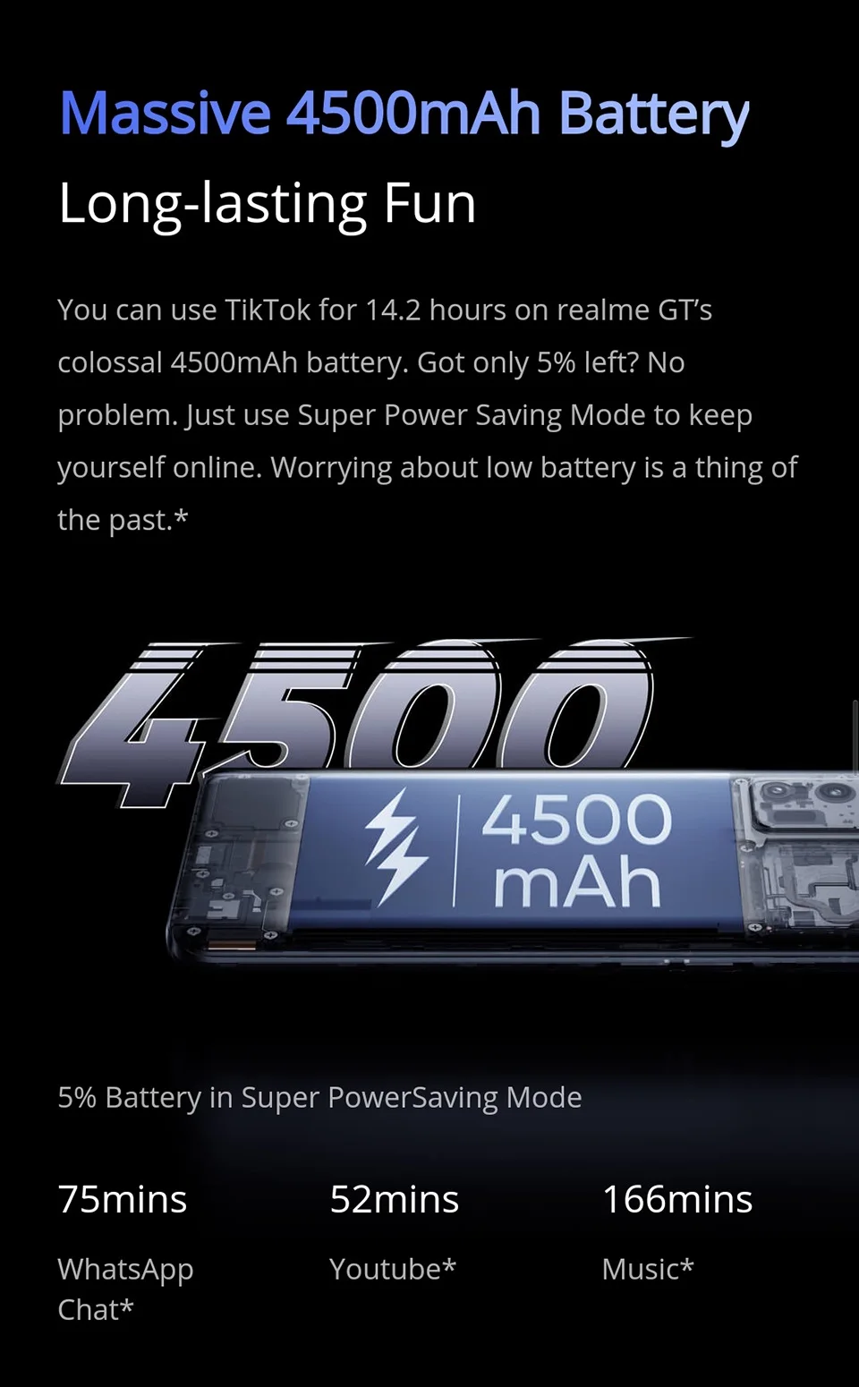 Вы можете использовать TikTok в течение 14,2 часов на realme GT's colossalАккумулятор 4500 мАч. Осталось всего 5%? Никаких проблем.