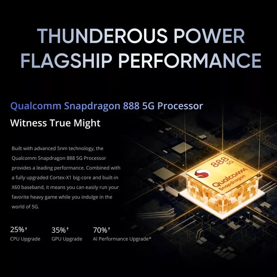 Изготовлен с передовой технологией 5 нм, QualcommПроцессор Snapdragon 888 5GОбеспечивает высокую производительность. В сочетании с полностью модернизированным Cortex-X1 большим ядром и встроенным базовым диапазоном X60, это означает, что вы можете легко запускать свою любимую тяжелую игру, пока вы побалуйте себя в мире 5G