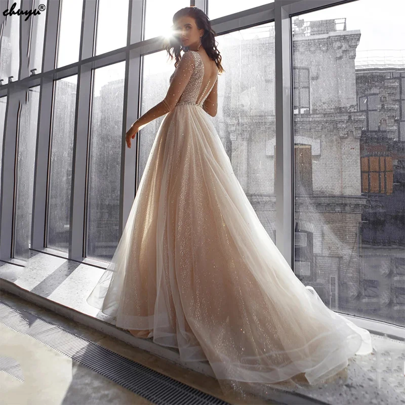 Элегантное блестящее ТРАПЕЦИЕВИДНОЕ ПЛАТЬЕ ChuYu из тюля с аппликацией в стиле бохо, свадебное платье с V-образным вырезом, длинными рукавами, кружевными пуговицами на спине, официальные мероприятия 2021