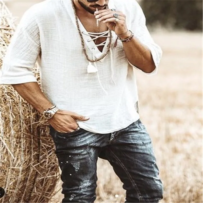 Мужская мода рубашка Хиппи Повседневная летняя пляжная свободная футболка с коротким рукавом и V-образным вырезом