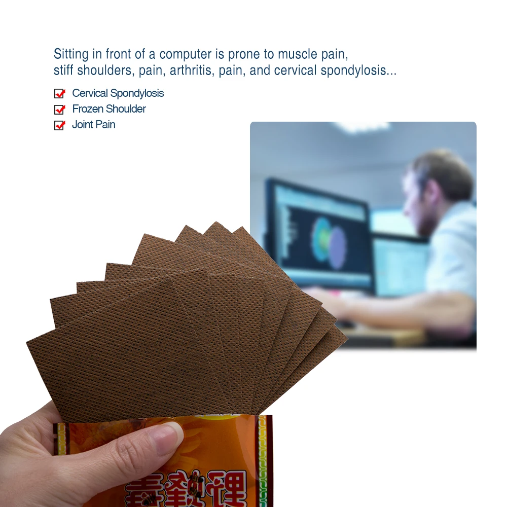 Features:1. Made of soft non-woven fabric, skin-friendly, breathable and comfortable.2. Selected and extracted essential ingredients for body pain problems, which are more effective, faster and longer lasting to relieve pain.3. The packaging is simple, the size is suitable, and it is convenient to carry.How to use:1.Clean and dry the affected area.2.Paste a patch on the affected area.3.Replace it every day.Note:1.Please don't use on broken skin or wounds.2.Please stop using if your are allergic to it after using.3.Prohibited for infants and pregnant women.